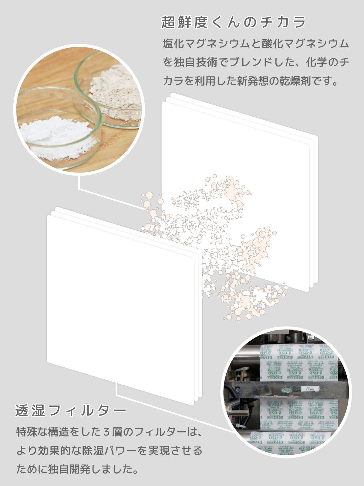 【超強力な乾燥剤の秘訣】塩化マグネシウムと酸化マグネシウムを独自技術でブレンドした、化学のチカラを利用した新発想の乾燥剤です。日本食品分析センターの分析結果で、ヒ素・重貴金類含有量は食品添加物規格以下であると証明されています。