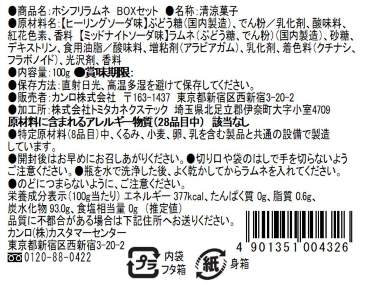 原材料表示:【ヒーリングソーダ味】ぶどう糖(国内製造)、でん粉/乳化剤、酸味料、紅花色素、香料 【ミッドナイトソーダ味】 ラムネ(ぶどう糖、でん粉)(国内製造)、砂糖、デキストリン、食用油脂/酸味料、増粘剤(アラビアガム)、乳化剤、着色料(クチナシ、フラボノイド)、光沢剤、香料