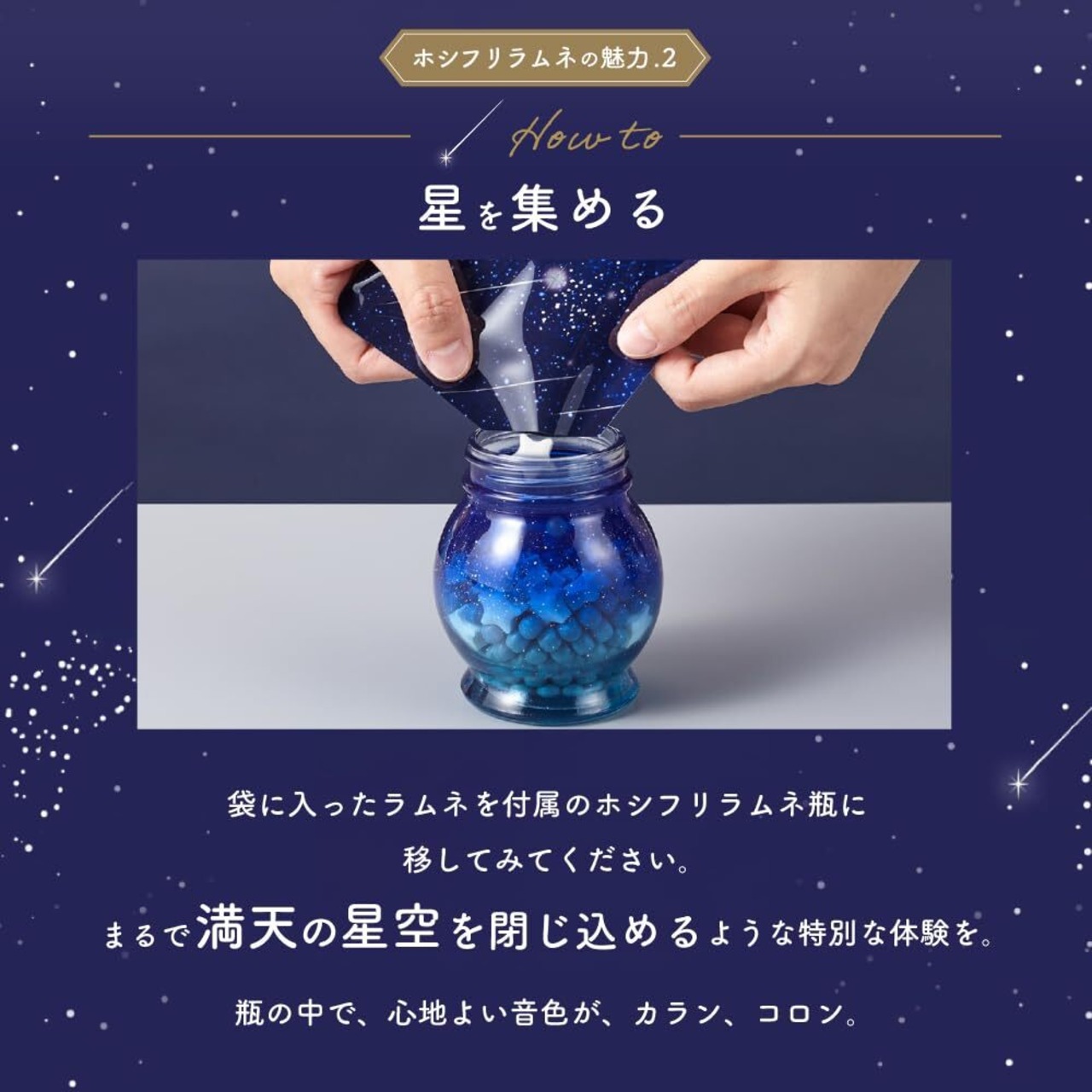 【音を楽しむ!】自分でラムネを瓶に入れることで、まるで満天の星空を手元の瓶に閉じ込めるような特別な体験ができます。ラムネを瓶に入れる時に、カランコロンと鳴る心地よい音色もお楽しみ頂けます。
