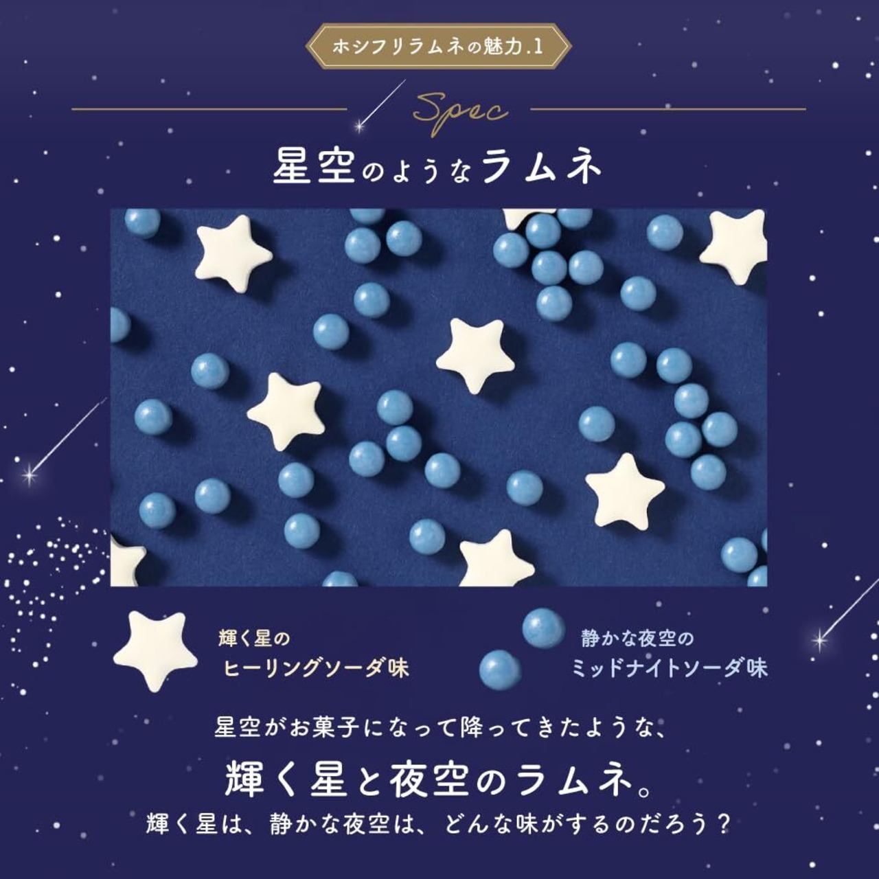 【星空がお菓子になって降ってきた!】夜空をイメージした紺色の「静かな夜空のミッドナイトソーダ味」はパリパリ食感のソーダフレーバー、黄色い星型の「輝く星のヒーリングソーダ味」はホロホロ食感のライチソーダフレーバーです。