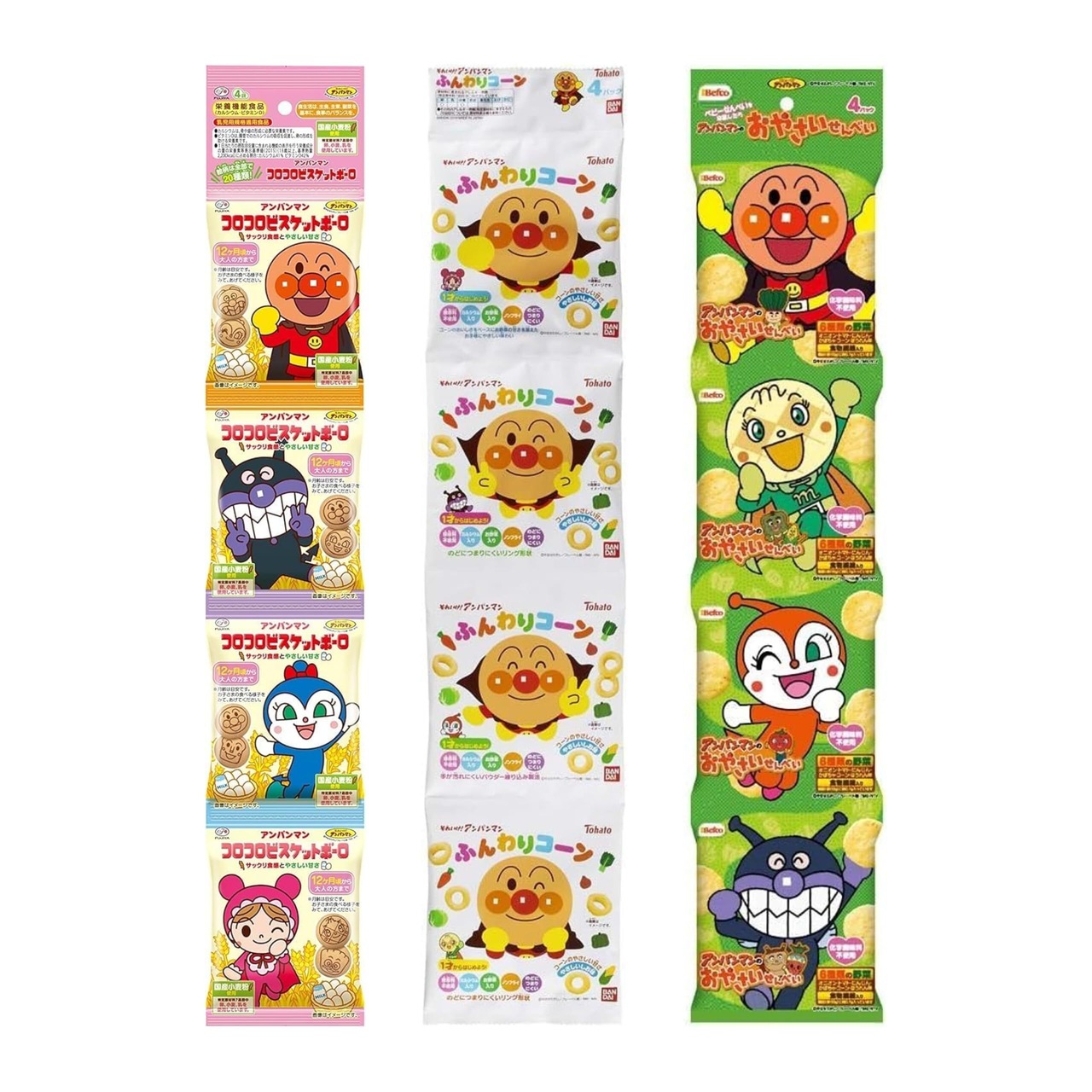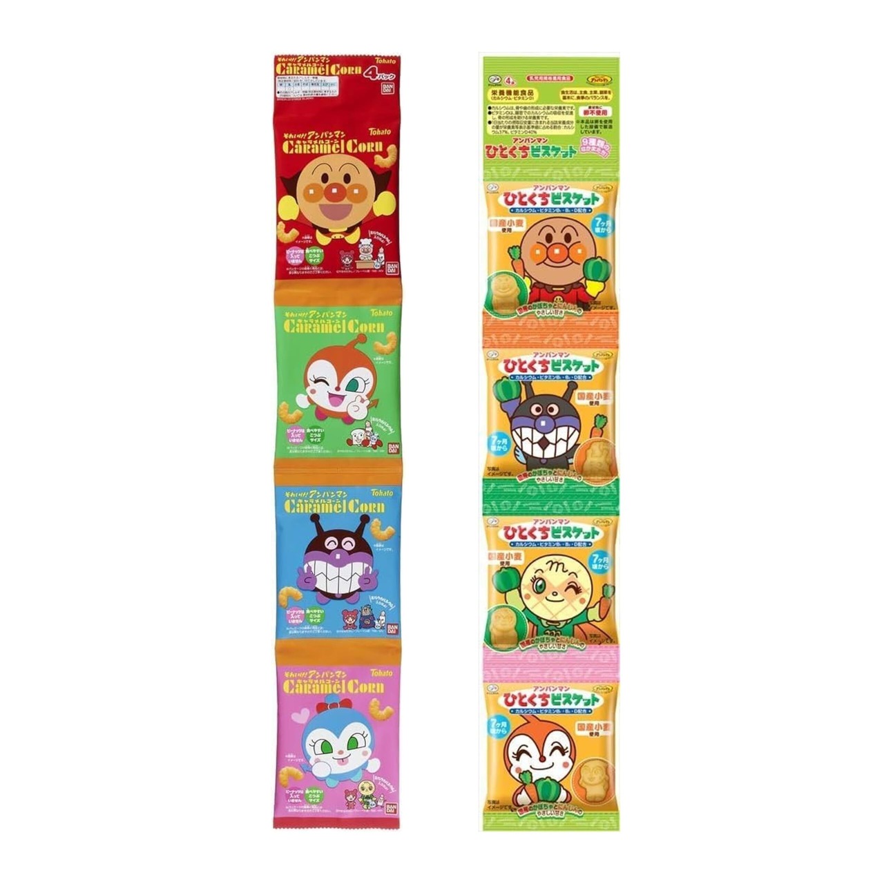 ひとくちビスケット ビスケットの形が新しくなり、種類も増えて、さらに楽しさがアップしたひとくちビスケットの食べきり4連タイプ 国産のかぼちゃとにんじんを使用しやさしい甘さに仕上げましたカルシウム、ビタミンDを配合した栄養機能食品です国産小麦使用、原材料に卵不使用です 原材料名:小麦粉、植物油脂、砂糖、バター、かぼちゃパウダー、にんじんペースト、全粉乳、でん粉、濃縮りんご果汁、牛乳、食塩/貝カルシウム、膨脹剤、香料、ビタミンE、ビタミンB1、ビタミンB2、ビタミンD コロコロビスケットボーロ 見て楽しい食べておいしいなかまたちのプリント入りビスケットボーロがおいしくなってリニューアル 国産小麦粉とばれいしょでん粉を使用したやさしいくちどけが特徴ですキャラクターのプリント絵柄は全部で20種類全種類のキャラクターが入っているわけではありません 原材料名:小麦粉、でん粉、砂糖、植物油脂、卵、粉末状小麦たん白、異性化液糖、脱脂粉乳、食塩、牛乳/貝カルシウム、膨脹剤、カラメル色素、香料(乳由来)、乳化剤、V.E、V.D ふんわりコーン 可愛いパッケージ1才からはじめよう保存料不使用カルシウム入り コーンのおいしさをベースに、お野菜の甘さを加えたお子様に優しい味わいです美味しい味を生地に練り込んであり、手がよごれにくいですのどにつまりにくいリング形状 原材料名:コーングリッツ(遺伝子組換えでない)、植物油脂、スイートコーンパウダー、食塩、パンプキンパウダー、オニオンパウダー、野菜ミックスパウダー、たんぱく加水分解物/卵殻未焼成Ca、香料、 乳化剤、甘味料(スクラロース)、調味料(アミノ酸)、 (一部に卵・小麦・大豆を含む) おやさいせんべい ベビーせんべいを卒業したら離乳食が完了する1歳4ヶ月頃~ 便利な4連パック 6種類の野菜を練りこみ、食物繊維を配合しましたお子様も食べやすいあっさりとしたオニオンスープ味です 原材料名:うるち米(国産)、植物油脂、でん粉、食物繊維(イヌリン)、米粉(うるち米(国産))、食塩、野菜粉末(ほうれん草、にんじん、オニオン、トマト、かぼちゃ、コーン)、 発酵調味料(小麦・大豆を含む)、たんぱく加水分解物(大豆を含む)、粉末しょう油(小麦・大豆を含む)、ガーリックパウダー(大豆を含む)、チキンブイヨンパウダー(乳成分を含む)、 チーズパウダー、黒胡椒、黒糖パウダー、ココアパウダー、酵母エキスパウダー キャラメルコーン 小分け出来る、4連包になっていますピーナッツ不使用、ミルクカルシウム入り、食べやすいこつぶサイズ 小分けパックなので普段のおやつにも外出先でも重宝しますパッケージにはクイズがついており、お子様とのコミュニケーションをお手伝いします牛乳約100ml分のミルクカルシウムが入っています 原材料名:コーングリッツ(遺伝子組換えでない)、植物油脂、砂糖、マーガリン、加糖れん乳、食塩/ソルビトール、乳清焼成Ca、カラメル色素、香料、(一部に乳成分・大豆を含む)