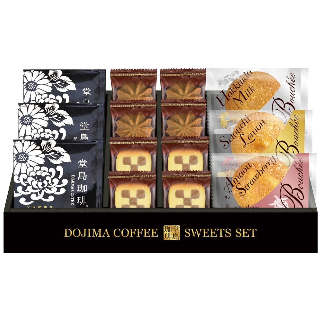 堂島珈琲ドリップコーヒー8g×3、ブッセ(あまおう苺・瀬戸内レモン・北海道ミルク)×各1、クッキー(コーヒー・チェス)×各4