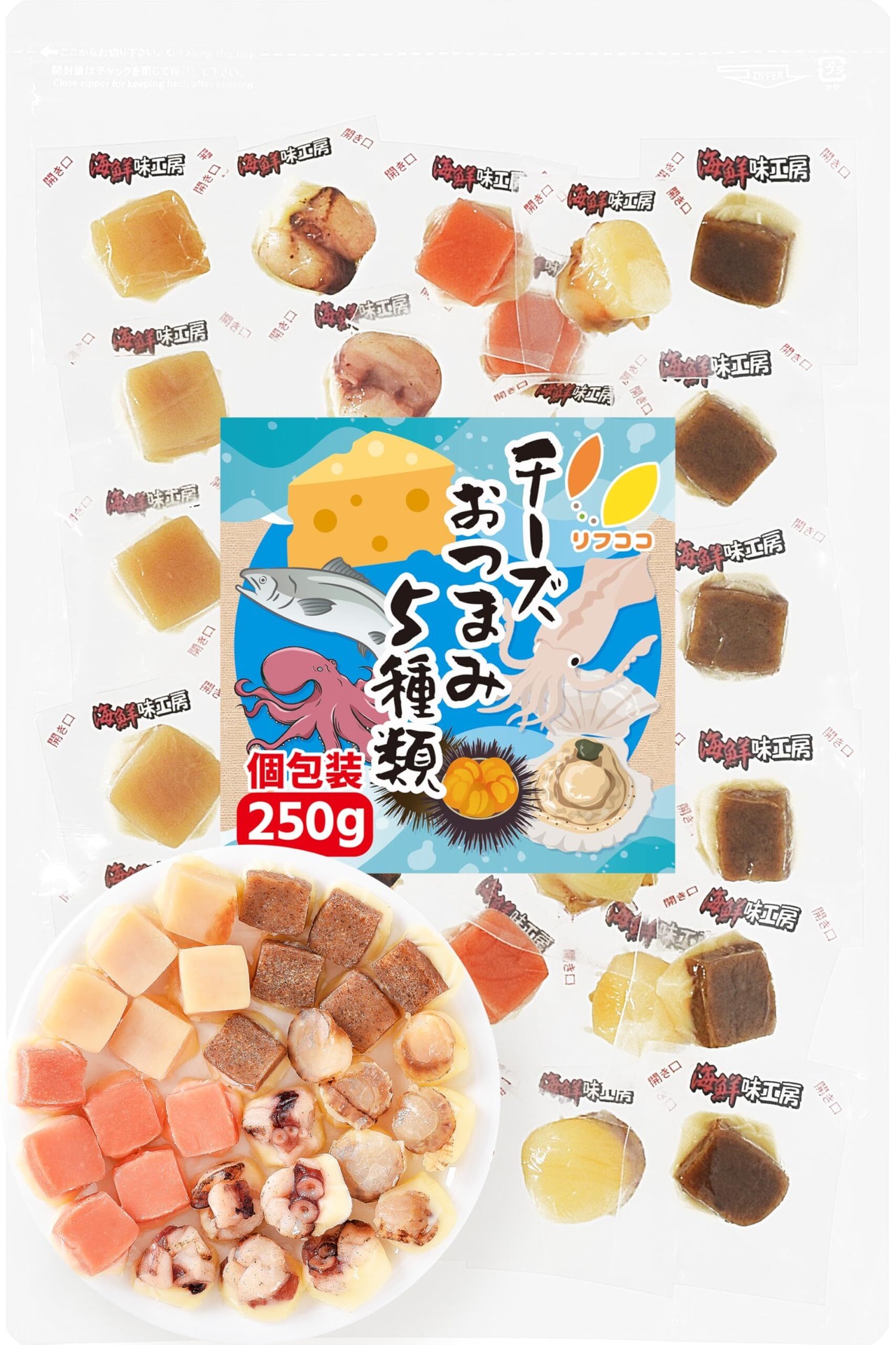 リフココ チーズおつまみ全5種類 詰め合わせ 個包装(ほたて 鮭 うにかま 焼いか 味付たこ)1袋 各50g入 計250g 珍味 お菓子 酒のつまみ うに ホタテ シャケ イカ タコ チャック付き袋入り