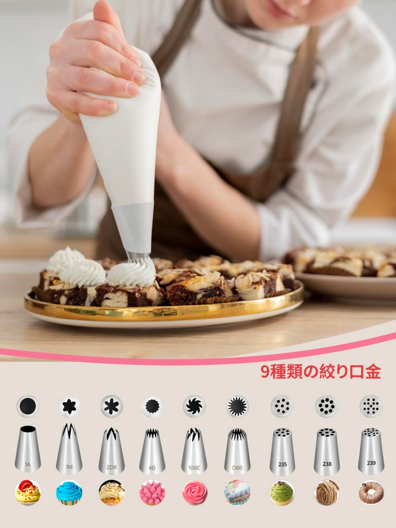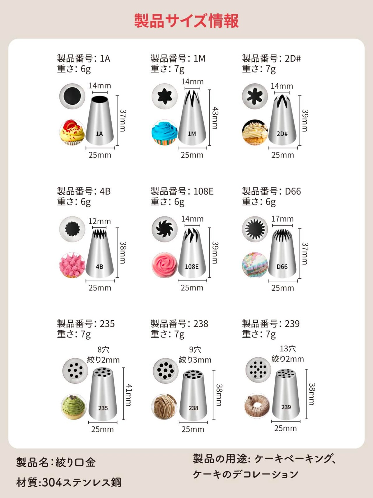 【優れた性能】一体成型のシンプル構造で汚れが溜まりにくく、水洗いするだけで簡単にお手入れ可能です。底面の安定した設計で作業中のズレを防止し、均一で美しいデザインを再現します。丸型花型はクリームの基本絞りに、シュークリーム専用口金はふんわりとした泡立てクリームの絞り出しに最適です。
