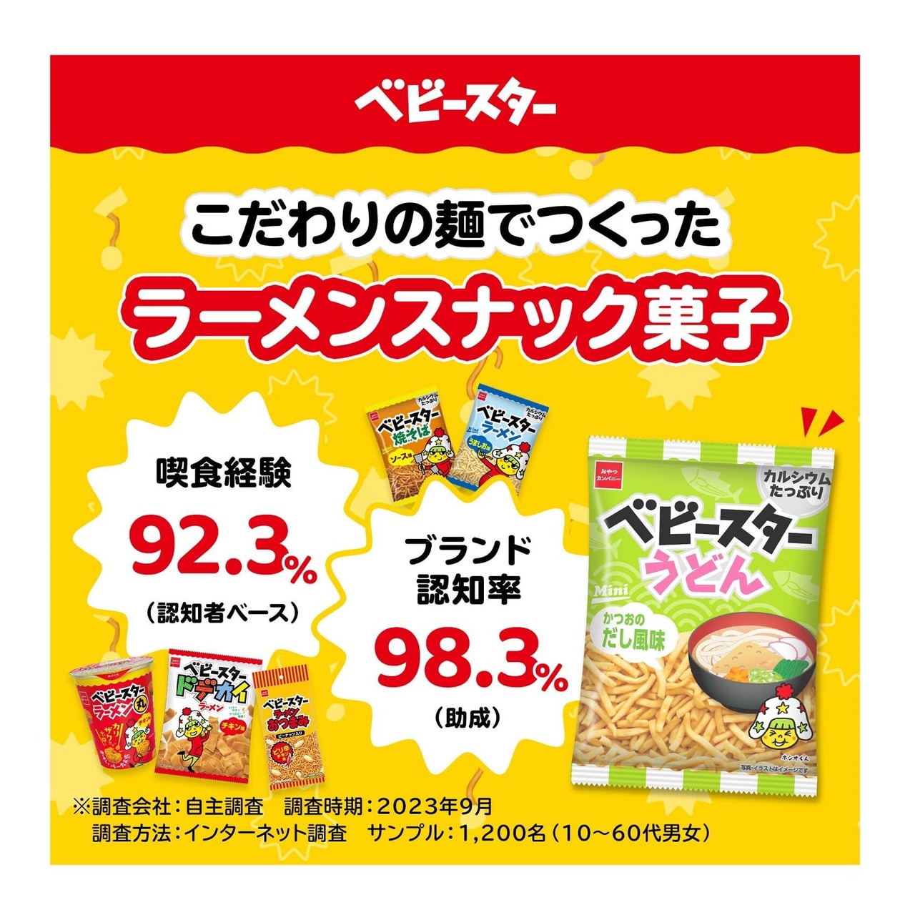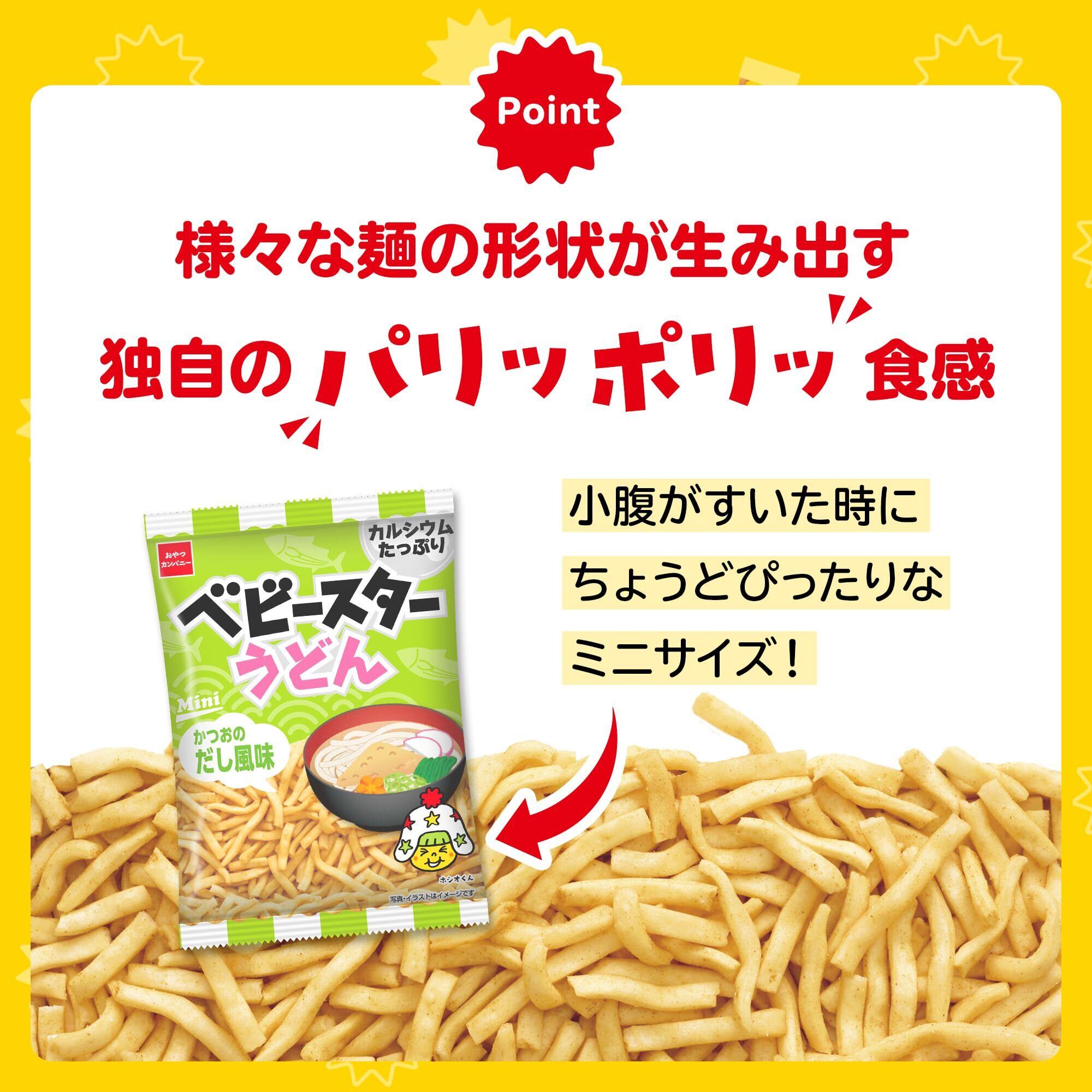 発売以来ロングセラー商品のベビースターラーメンのミニサイズバージョンになります。小腹がすいた時にちょうどぴったりな20g! ! そしてベビースターラーメンに新フレーバー「うどんかつおだし味」の登場です。ふんわりと香るかつおのだし風味が特徴のベビースターラーメンです。