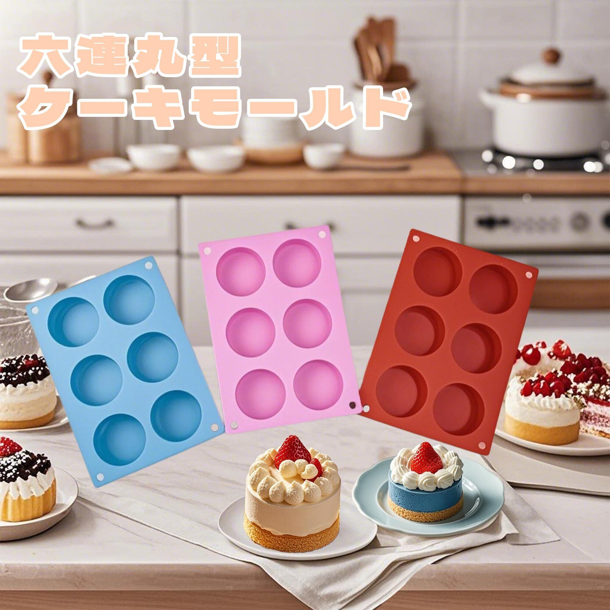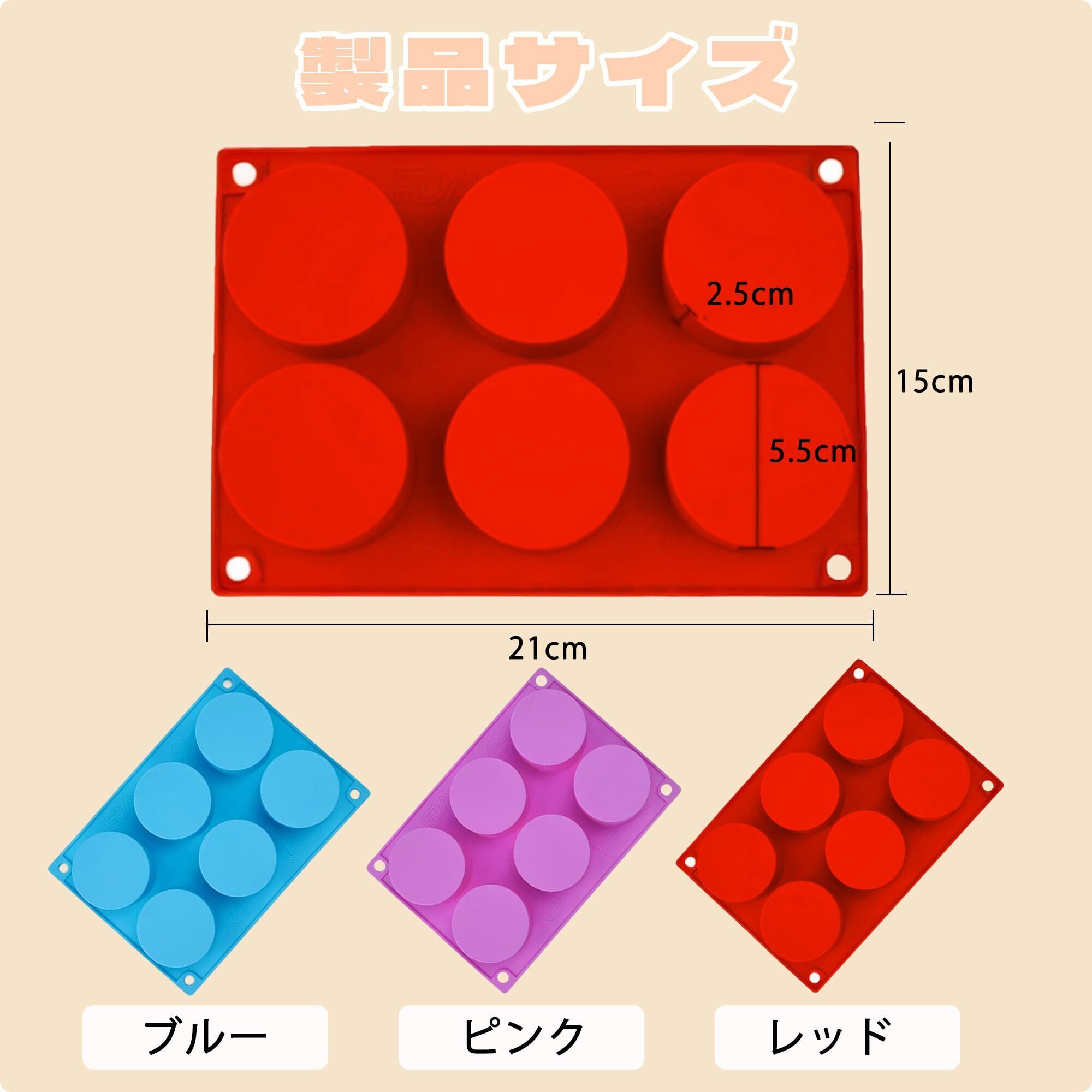 【商品詳細】六連円形設計のシリコン 型で、サイズは約21cm × 15cm、高さ2.5cm。ピンク、レッド、ブルーの3色からお選びいただけます。異なる美意識に合わせたカラーバリエーションをご用意しています。