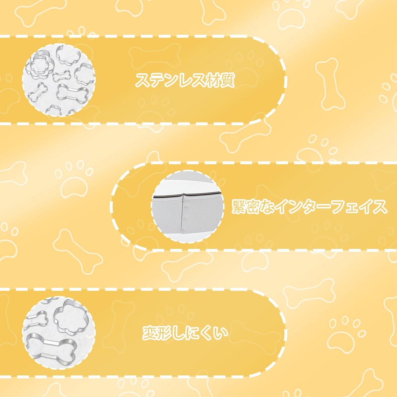 【クッキー型】とても可愛い肉球とボーン型のクッキー型です。5種類のサイズがあって、家族と一緒に美味しいクッキーを作りましょう! 【高品質】食品グレードの430ステンレス鋼で作られており、無毒無臭、錆びにくく、頑丈で耐久性があります。クッキー型は研磨されたエッジ処理が施されているため、手を切ることがなく、快適に使用できます。 【使いやすい】クッキーカッターをクッキー生地に押し入れ、生地を平らに巻くだけ、初心者でも簡単においしいビスケットが作れます。子供にも大人にも適しています。 【幅広い用途】クッキー型だけでなく、クッキー生地、フォンダン、ソフトフルーツ、ゼリー、チーズ、クラフト粘土に適します。パーティー、誕生日、クリスマス、新年、正月、お祭り、幼稚園手作りなどに最適です。 【パッケージ】クッキー型10個セット。詳しいサイズは写真を参考してください。
