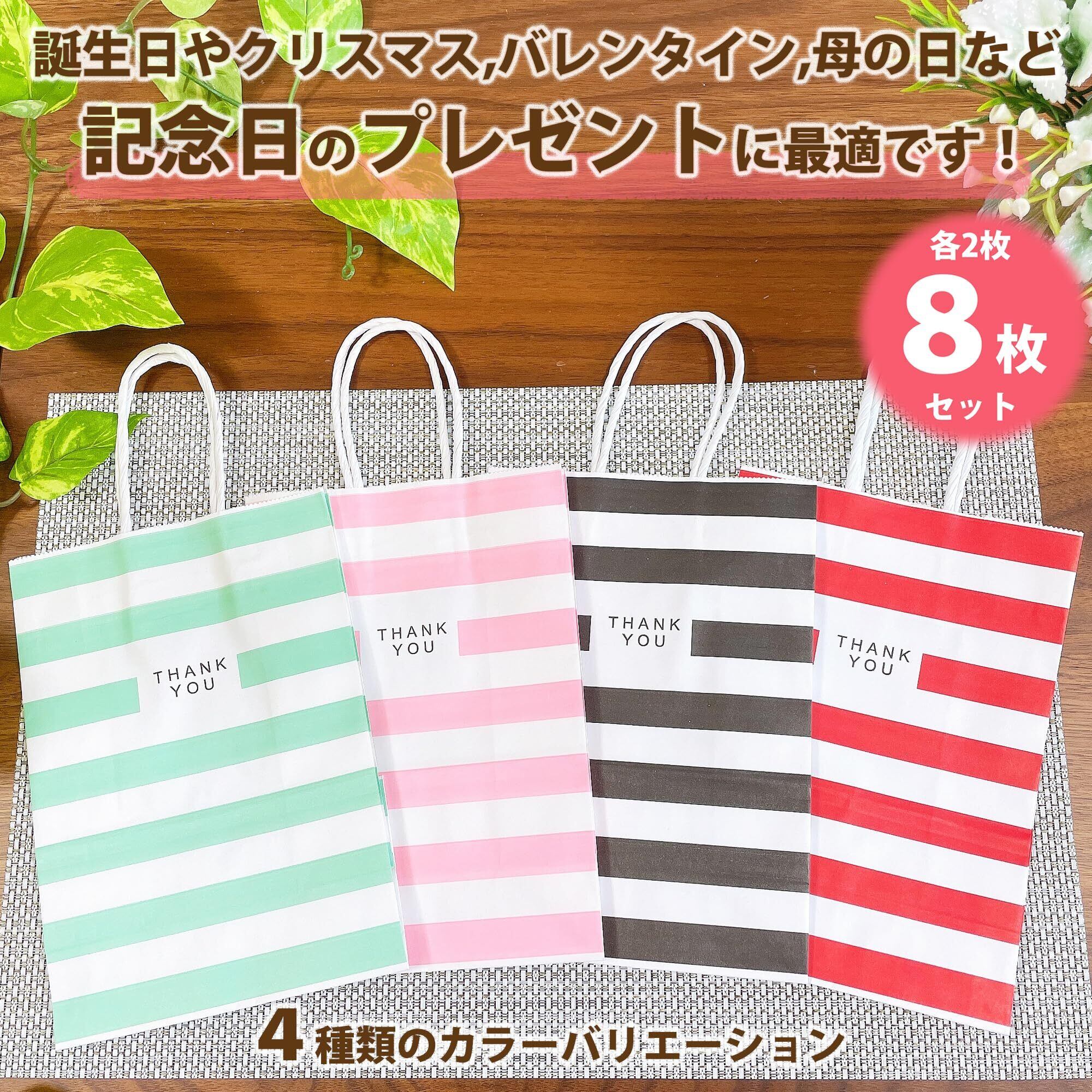【トゥルーハーツ】ラッピング 袋 ギフトバッグ 8枚セット 4種類 おしゃれ 可愛い プレゼント 紙袋 紙バッグ 手提げ お菓子 小物 マチあり ストライプ柄 赤 黒 青 ピンク 中サイズ (高さ21cm×幅15cm×マチ8cm)