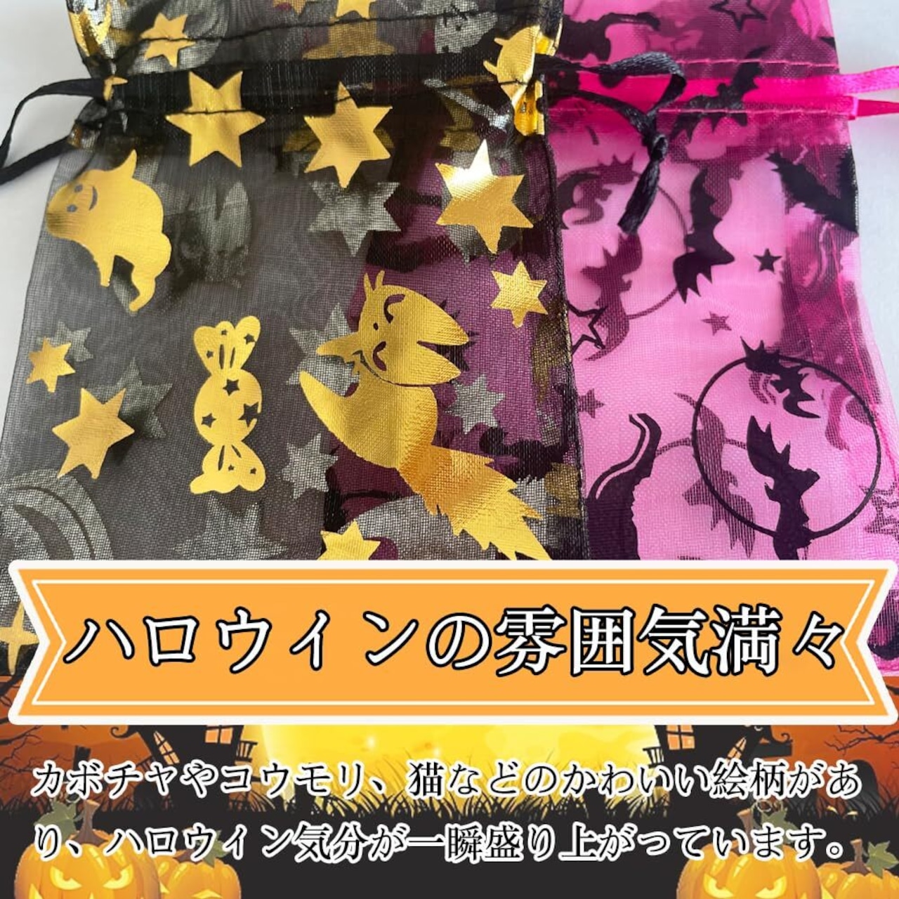ハロウィンの雰囲気満々の2パターンセット:カボチャやコウモリ、黒猫などのかわいい絵柄があり、ハロウィン気分が一瞬盛り上がっています。場合により、またはキャンディーの種類のによって異なった柄のキャンディーバッグを選択してお使いいただけます。とても便利です。
