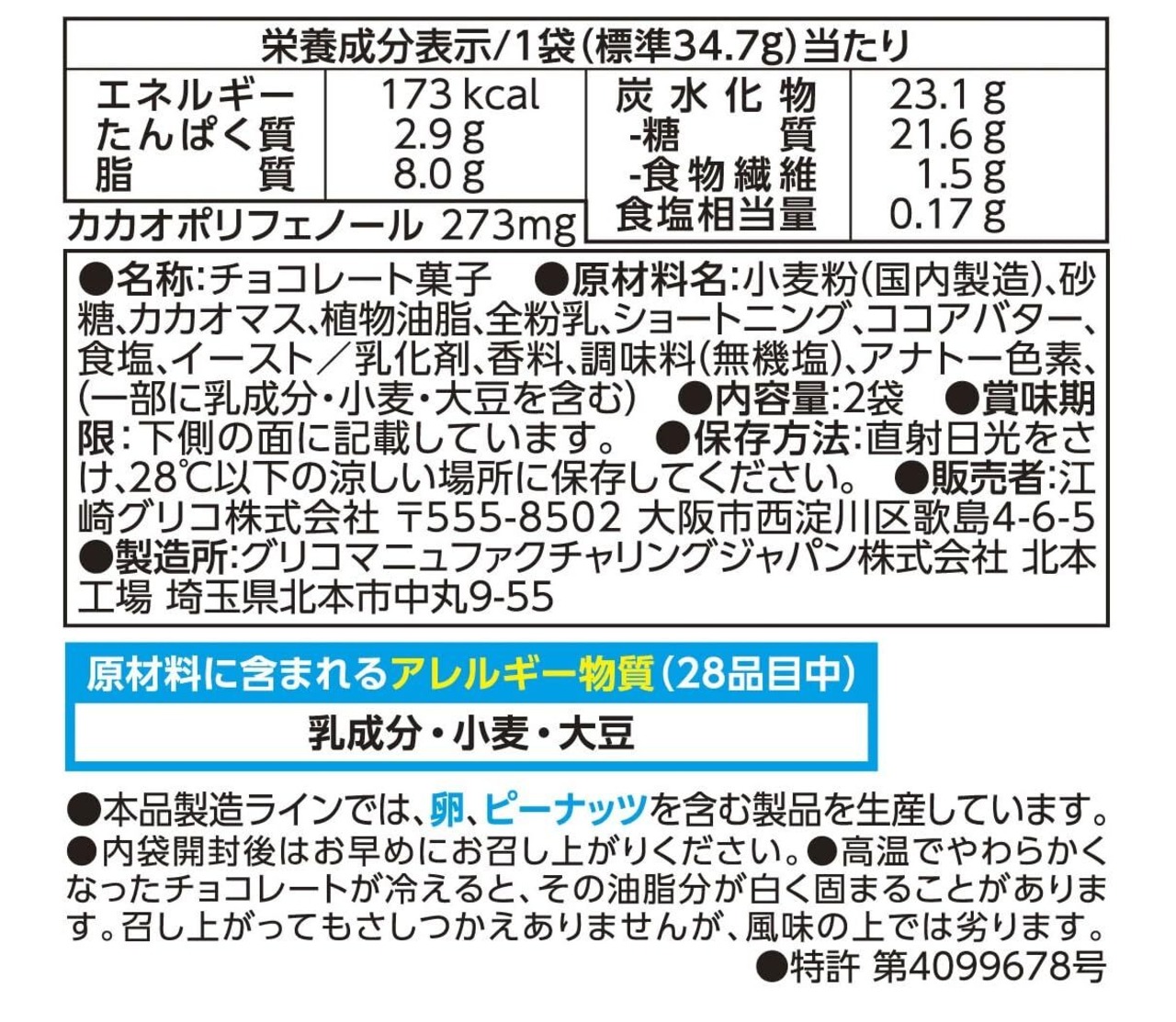 小麦粉(国内製造)、砂糖、カカオマス、植物油脂、全粉乳、ショートニング、ココアバター、食塩、イースト/乳化剤、香料、調味料(無機塩)、アナトー色素、(一部に乳成分・小麦・大豆を含む)