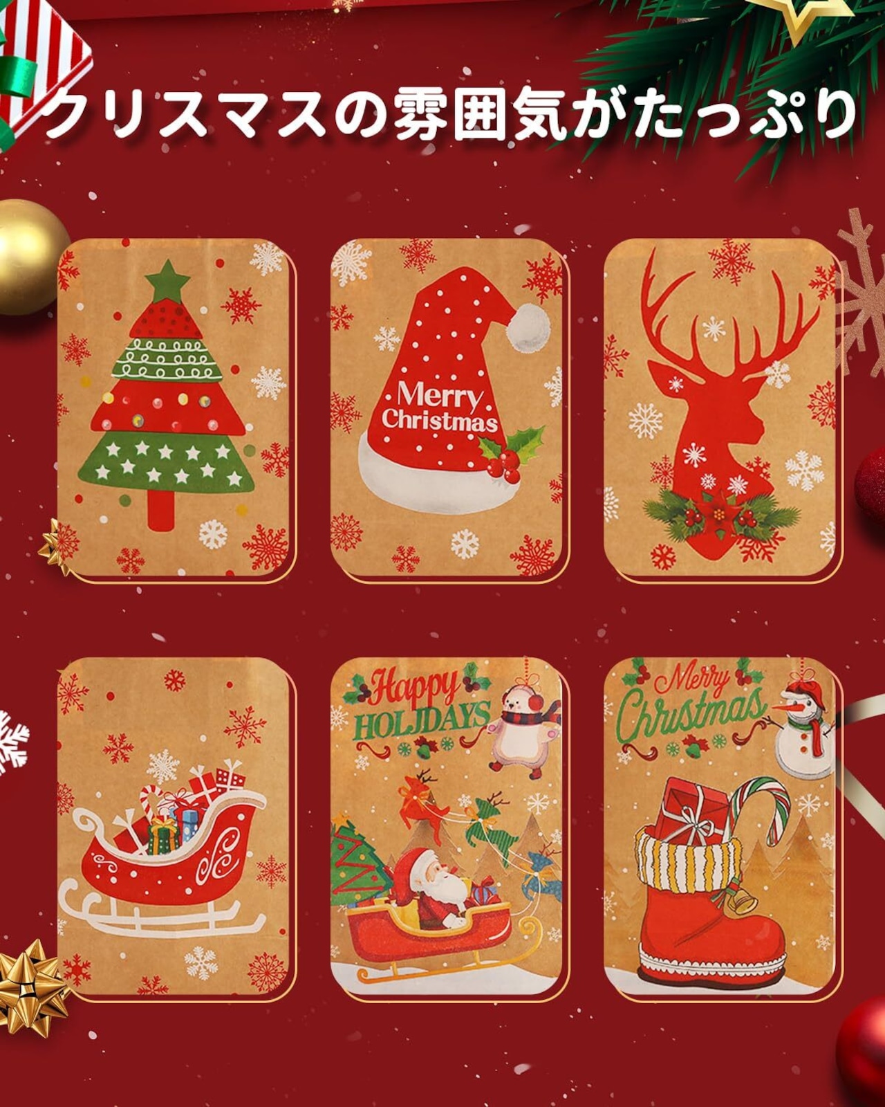 【サイズ】3種類のサイズがあり、それぞれ21 x 15cm、27 x 21cm、33 x 26cmです。サンタクロース、トナカイ、手袋、雪のデザインは、子供から大人まで幅広く使え、サイズも選べるので、小さなものから大きなギフトまで入れられます。
