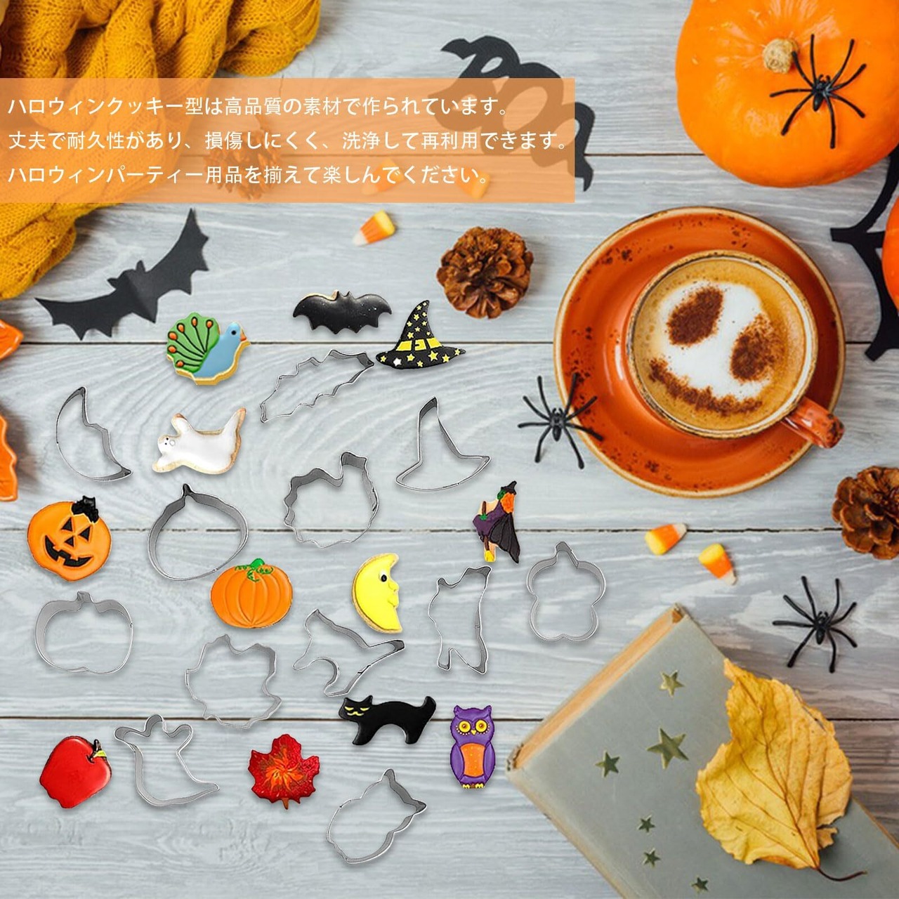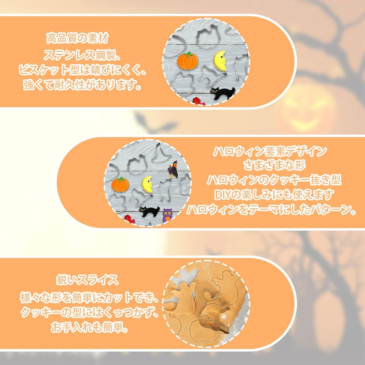 【ハロウィンクッキー型】 おばけ、カボチャ、コウモリ、ウィザードハット、猫、フクロウなどさまざまな形状とサイズがあって、ハロウィンの要素が満載です。お菓子に不気味で面白い雰囲気を加えることができます。 一緒においしいビスケットを作りましょう。 【高品質】食品グレードの430ステンレス鋼で作られており、錆びにくく、高温に強く、頑丈で耐久性があります。クッキー型はエッジがなく、研磨されたエッジ処理が施されているため、手を切ることがなく、快適に使用できます。 【使いやすい】カッターの形を生地に押し込むだけで、初心者でも簡単においしいビスケットが作れます。ハロウィンをテーマにした楽しいクッキーをいろいろ作って、お祭りの雰囲気を盛り上げましょう! 【幅広い用途】クッキーだけでなく、フォンダン、ソフトフルーツ、ゼリー、チーズ、おにぎり、パン、工芸品、粘土などにも適します。ハロウィン、パーティー、誕生日、幼稚園手作り、お祭りなどに最適です。 【パッケージ】ハロウィン クッキーカッター12個セット。