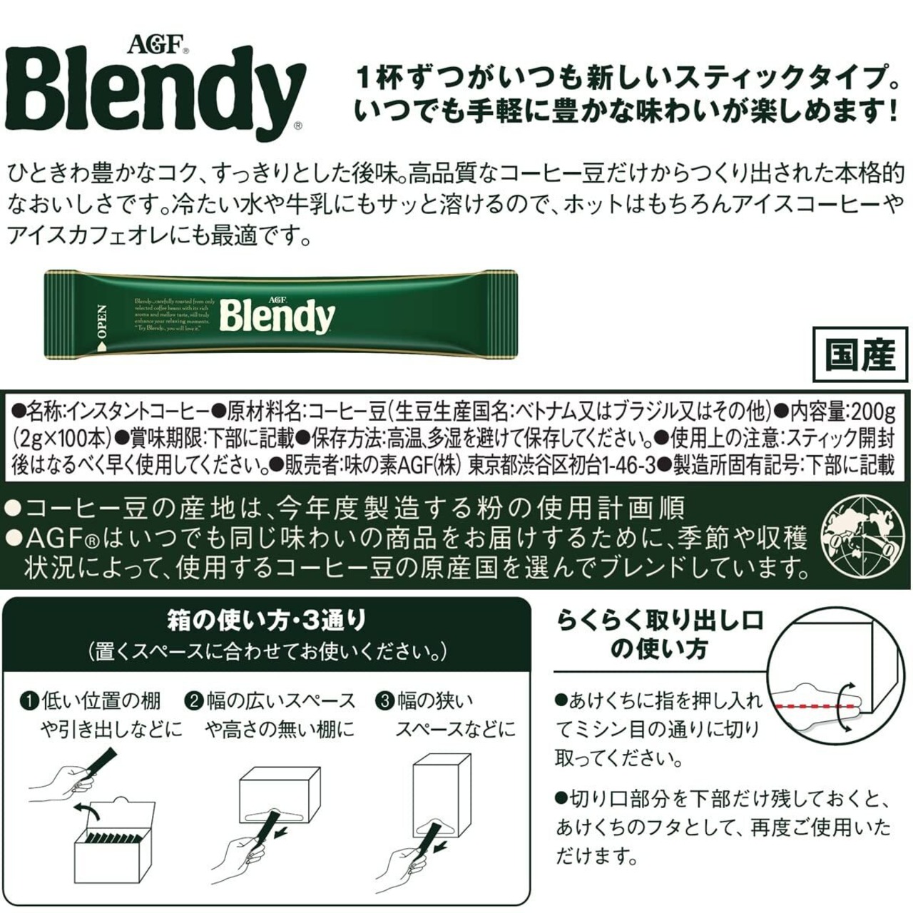 AGF(エージーエフ) 「ブレンディ」 スティック100本は、まろやかで豊かなコクと香り。冷たい水や牛乳にもおいしく溶ける、「ブレンディ」パーソナルタイプのお得な大容量サイズです。1杯1杯がいつも新鮮な個包装スティックコーヒー(ブラック、ミルクなし、甘さなし)です。
