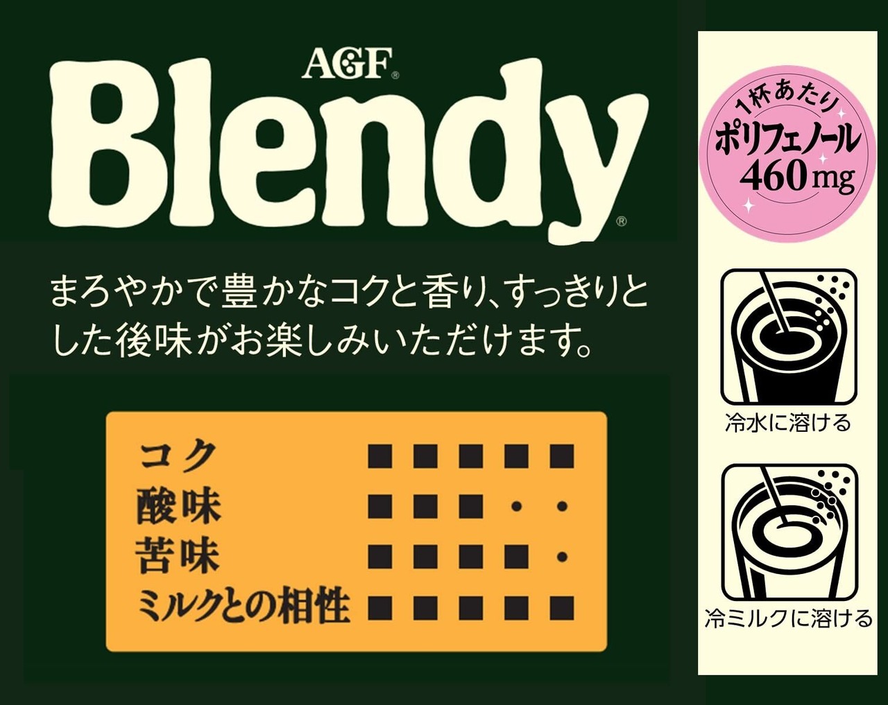 「カフェオレは、得意なんです。ブレンディ。」でおなじみの「Blendy(ブレンディ)」 インスタント・コーヒーは、独自の焙煎技術により、まろやかで豊かなコクと香りが楽しめます。スプレードライ製法にひと手間加えた独自のアグロマート製法の粉末なので、冷たい水や牛乳(ミルク)にも簡単に溶け、ホットはもちろん、アイスコーヒーやアイスカフェオレにも最適です。