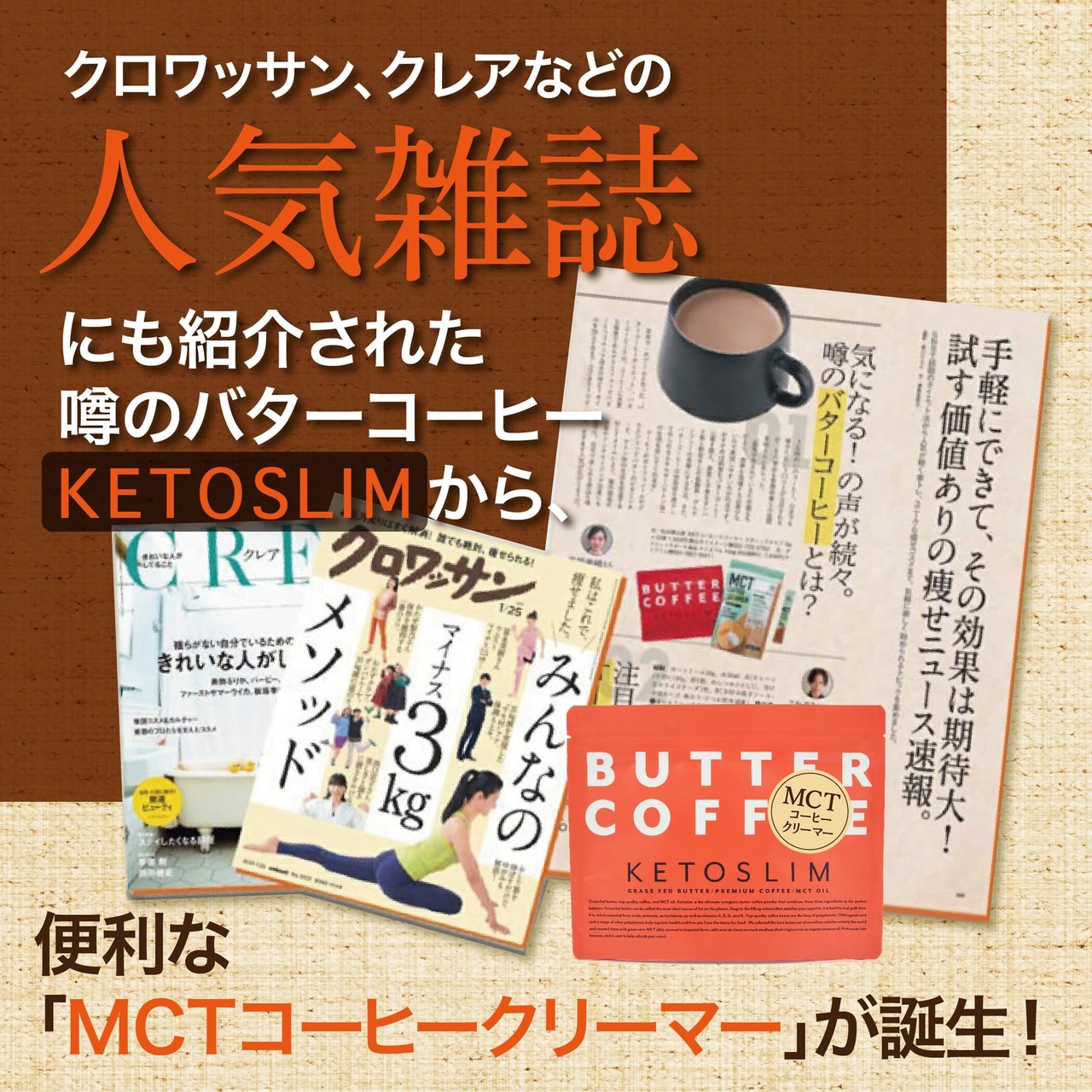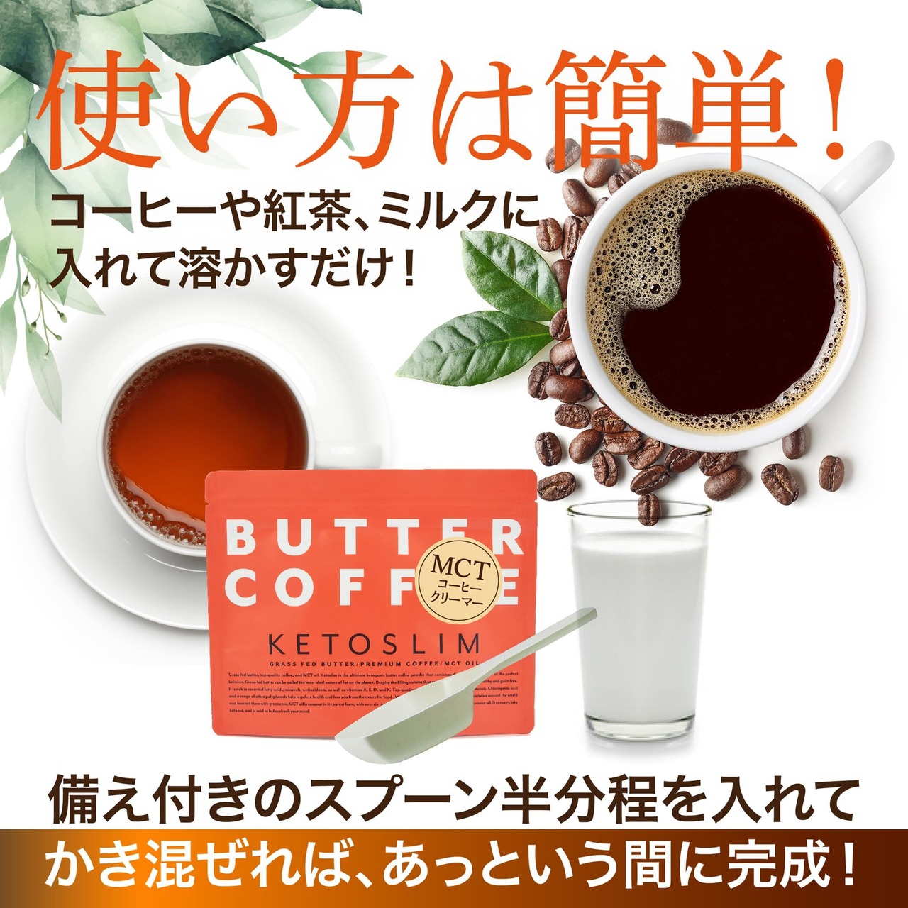 置き換えの新定番「KETOSLIM ~ケトスリム~」からMCTコーヒークリーマーが登場! コーヒーにグラスフェッドバター、MCTオイルを加えて作る 「バターコーヒー」 全米で大ブームになり、日本でも話題沸騰の新しいボディケア方法です。