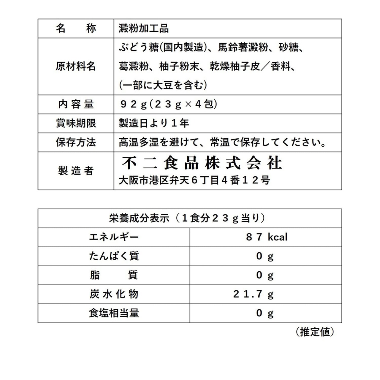 原材料:ぶどう糖(国内製造)、馬鈴薯澱粉、砂糖、葛澱粉、柚子粉末、乾燥柚子皮/香料、(一部に大豆を含む)