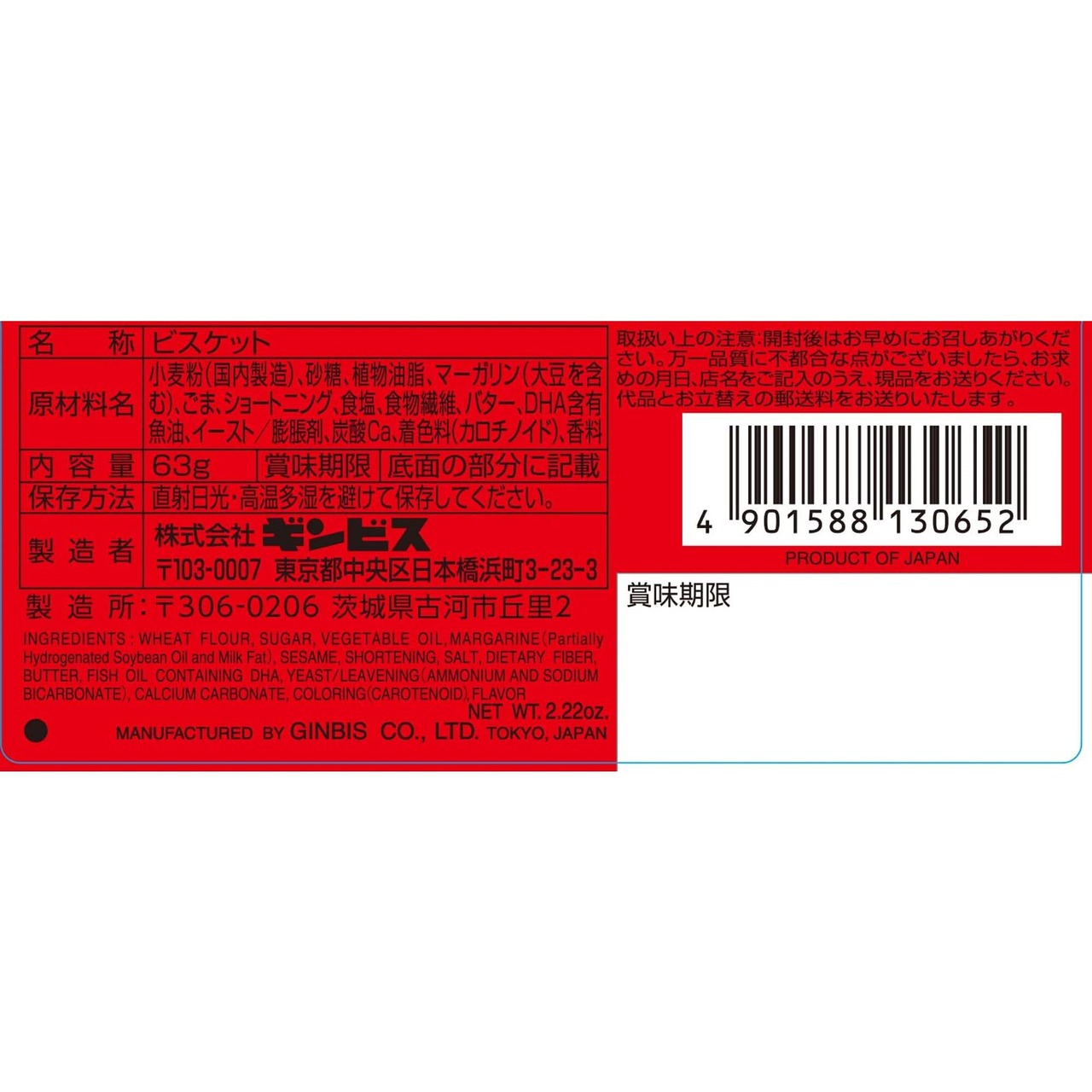 小麦粉、砂糖、植物油脂(パーム油)、マーガリン(大豆を含む)、白胡麻、ショートニング(豚肉を含む)、食塩、食物繊維、バター、DHA含有魚油、イースト、膨脹剤、炭酸Ca、着色料(カロチン)