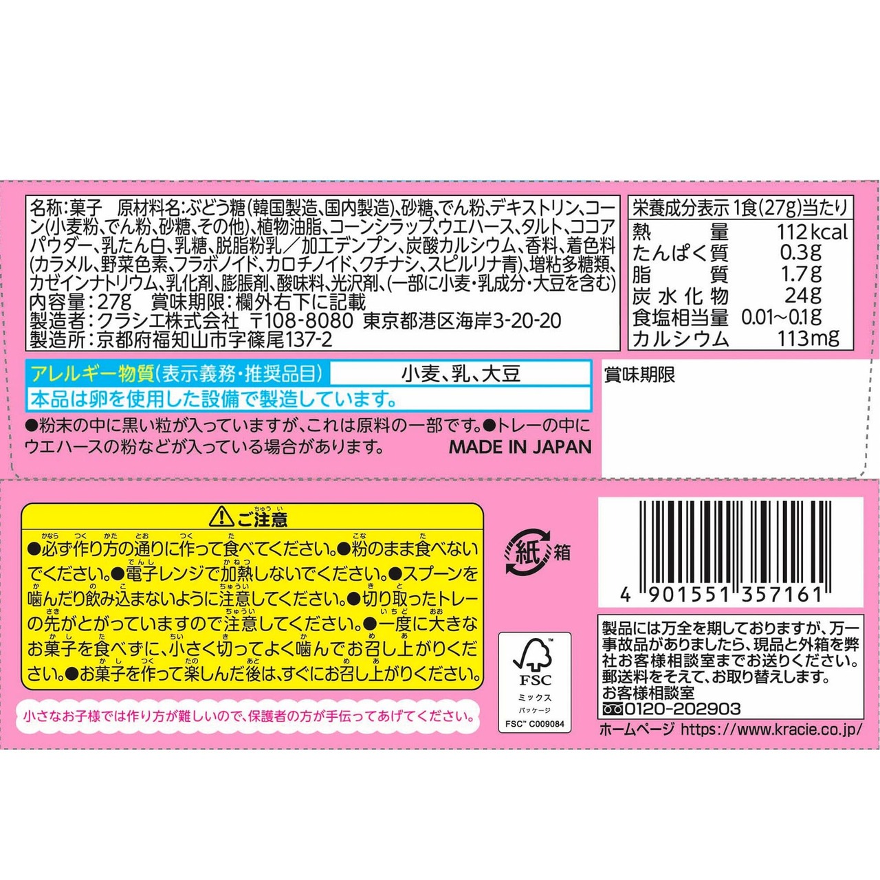 ぶどう糖(韓国製造、国内製造)、砂糖、でん粉、デキストリン、コーン(小麦粉、でん粉、砂糖、その他)、植物油脂、コーンシラップ、ウエハース、タルト、ココアパウダー、乳たん白、乳糖、脱脂粉乳/加工デンプン、炭酸カルシウム、香料、着色料(カラメル、野菜色素、フラボノイド、カロチノイド、クチナシ、スピルリナ青)、増粘多糖類、カゼインナトリウム、乳化剤、膨脹剤、酸味料、光沢剤、(一部に小麦・乳成分・大豆を含む)
