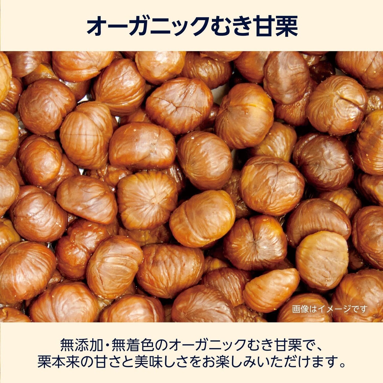 添加・無着色のオーガニックむき甘栗で、栗本来の甘さと美味しさをお楽しみいただけます。むき甘栗に使用される栗は中国特産の品種です。その中でも河北省遷西県は、数ある栗の産地の中でも特に甘味が多く風味豊かな中国最高級の栗として有名です。生産工場では、HACCP、FCCS、有機JAS認定などを取得し、行き届いた管理を行っています。