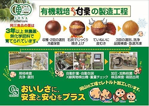 原料にこだわり、有機JAS認定の農家で栽培された栗だけを使用しています。一粒一粒丁寧に皮をむいてあるので、食べやすくなっています。賞味期限が210日間あるため、保存食としても適しています。防腐剤を一切使わず、無添加でおいしく国内でレトルト加工しました。素材本来の自然な甘みをお楽しみください。