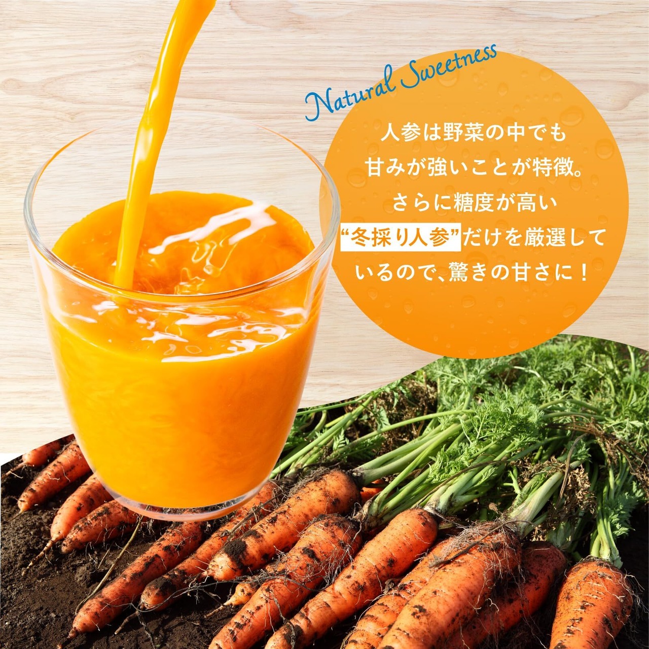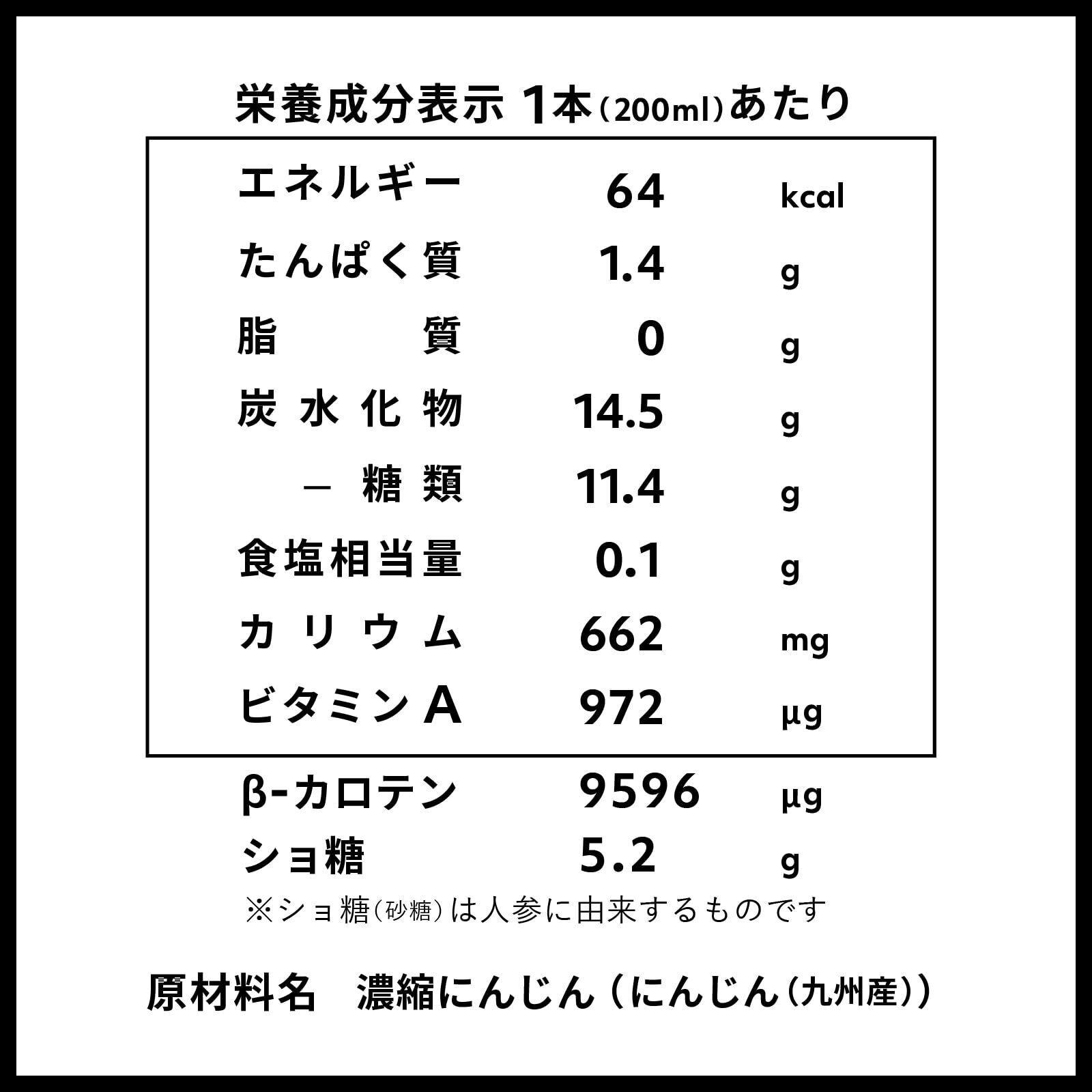 12~3月の寒い時期に収穫した九州産の人参だけを使用した人参100%ジュースです。冬に収穫した人参は青臭み・えぐみが弱く、甘みがあって飲みやすいのが特長です。2人参2本分使用しており、200mlあたりのβカロテンは9,596㎍。酸味料やレモン果汁を使用していないので料理にもご使用頂けます。冷やすとより美味しくお飲みいただけます。
