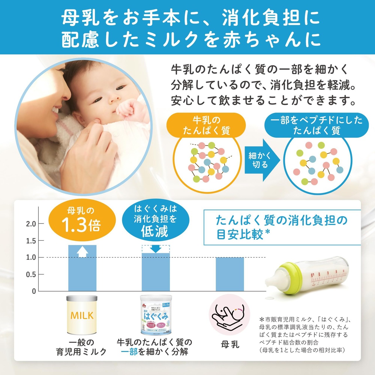 【0ヶ月の新生児~1歳頃までのベビーミルク】はぐくみは、全国の産婦人科でも使われている粉ミルクです。離乳食にも活用できます。※ミルクを作る前には、手を洗い、器具(哺乳瓶や、哺乳瓶ブラシなど)は消毒して使いましょう。専用のスプーンで正確にはかりましょう。1回ごとに調乳して飲ませてあげてください。作り置きや飲み残しは与えないでください。
