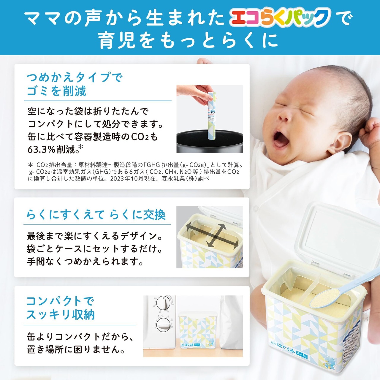 【「はぐくみ」使い方に合わせて選べるラインアップ】400gごとの小分けパックで、調乳らくらくな入れかえタイプの粉ミルク「エコらくパック」、たっぷり使える「大缶」、母乳と混合の方に便利な「小缶」、お出かけや夜間の調乳にも便利な「スティックタイプ」の4種類からお選びください。