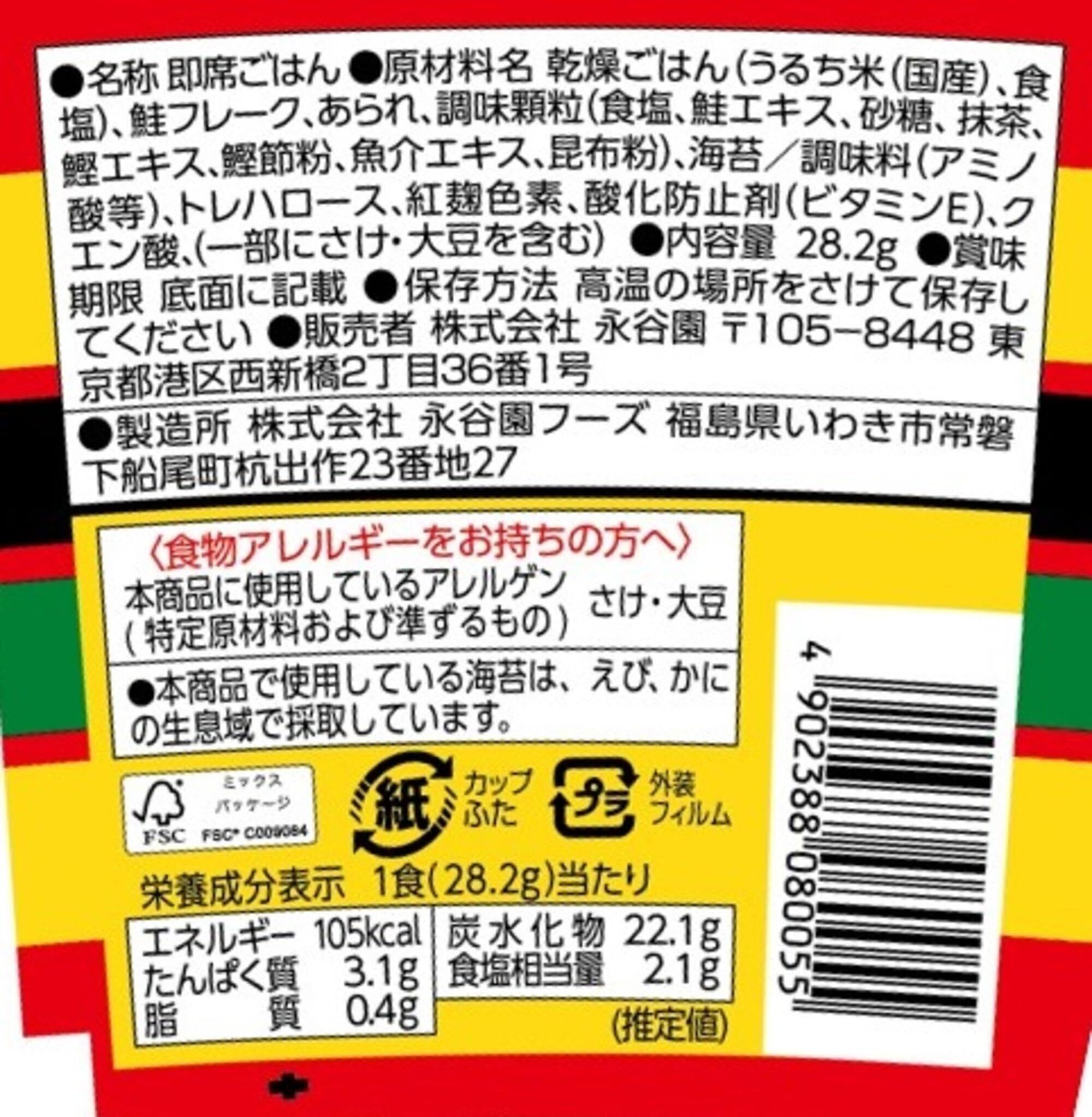 乾燥ごはん(うるち米(国産)、食塩)、鮭フレーク、あられ、調味顆粒(食塩、鮭エキス、砂糖、抹茶、鰹エキス、鰹節粉、魚介エキス、昆布粉)、海苔/調味料(アミノ酸等)、トレハロース、紅麹色素、酸化防止剤(ビタミンE)、クエン酸、(一部にさけ・大豆を含む)