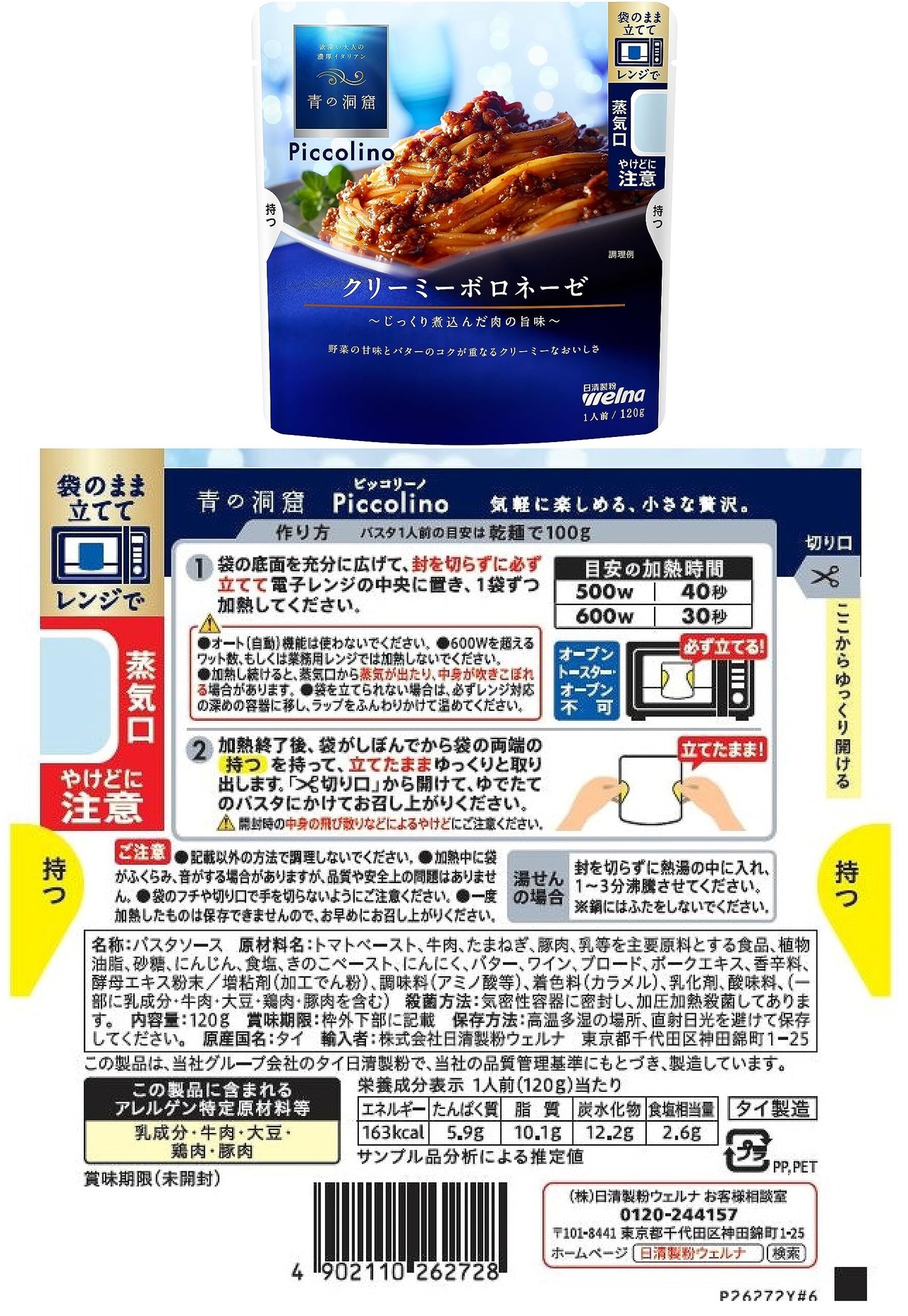 【クリーミーボロネーゼ】:じっくり煮込んだ肉の旨味野菜の甘味とバターのコクが重なるクリーミーなおいしさ。青の洞窟ならではの“贅沢なおいしさ”はそのままに、電子レンジ調理可能に。