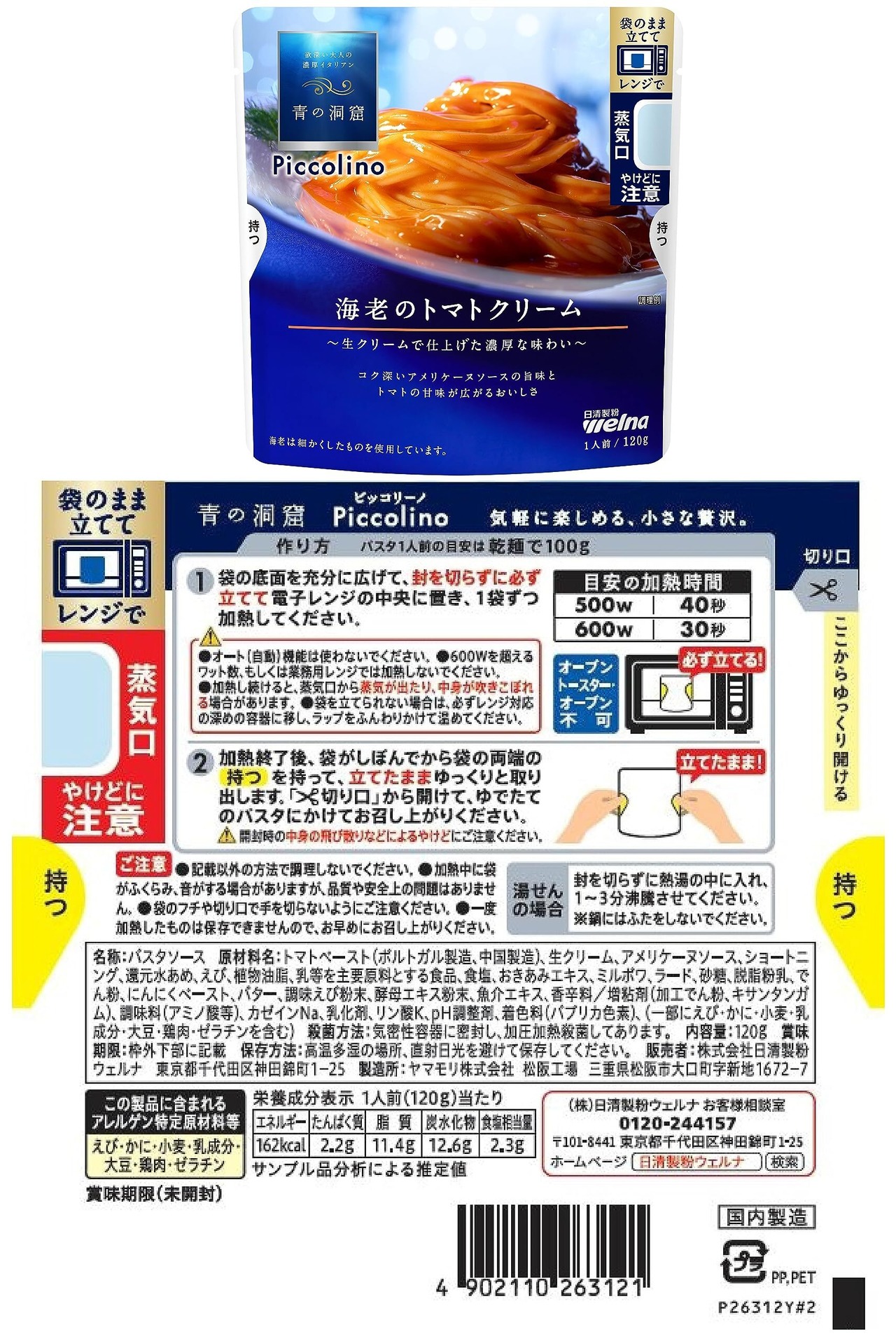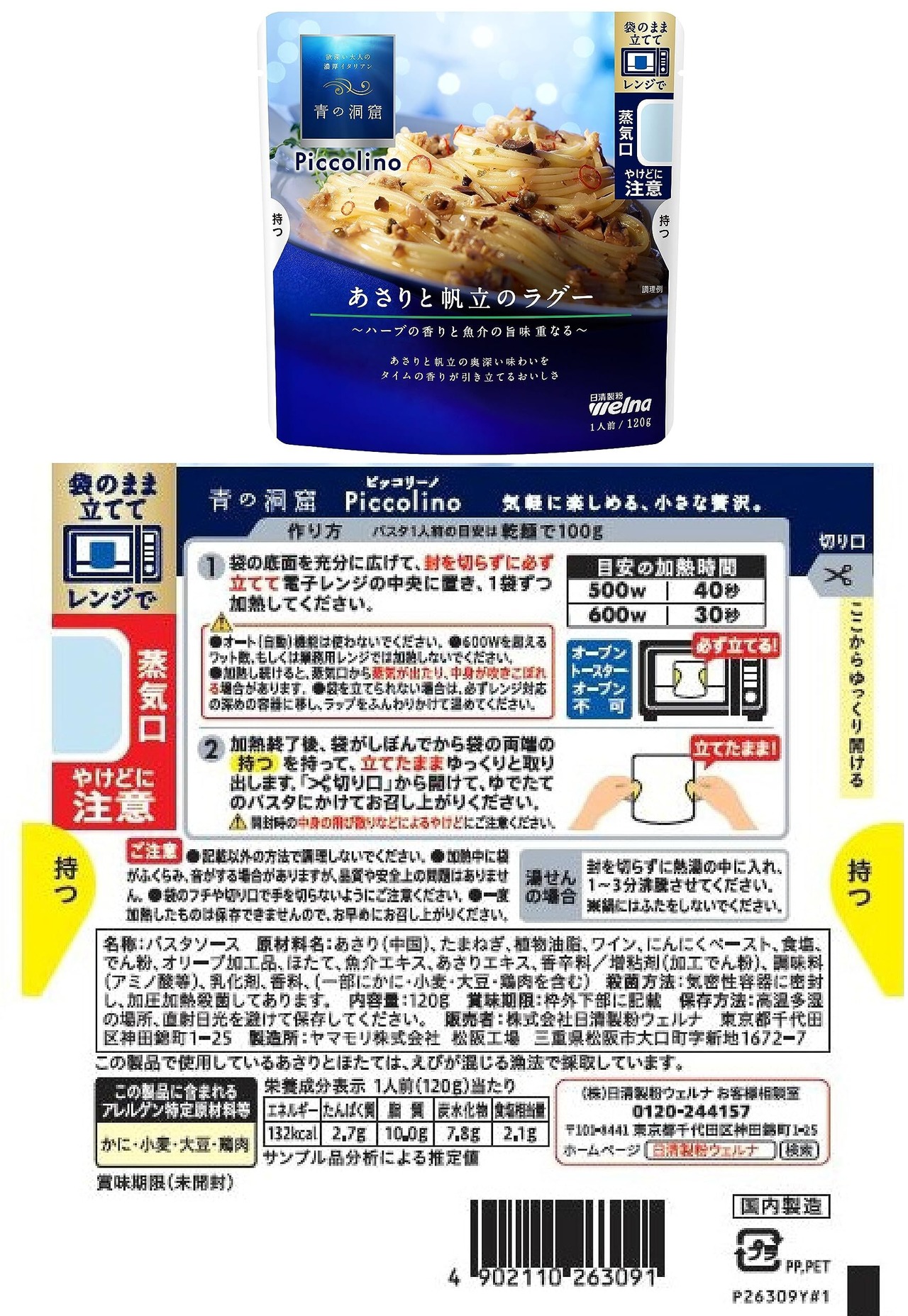 【クリーミーボロネーゼ】:トマトペースト、牛肉、たまねぎ、豚肉、乳等を主要原料とする食品、植物油脂、砂糖、にんじん、食塩、きのこペースト、にんにく、バター、ワイン、ブロード、ポークエキス、香辛料、酵母エキス粉末/増粘剤(加工でん粉)、調味料(アミノ酸等)、着色料(カラメル)、乳化剤、酸味料、(一部に乳成分・牛肉・大豆・鶏肉・豚肉を含む)【マスカルポーネのポモドーロ】:トマト・ジュースづけ(イタリア製造)、たまねぎ、トマトペースト、植物油脂、チーズ、砂糖調整品、食塩、にんにくペースト、でん粉、香辛料、乳等を主要原料とする食品/増粘剤(加工でん粉)、乳化剤、調味料(アミノ酸等)、リン酸K、カゼインNa、(一部に乳成分・大豆を含む)【あさりと帆立のラグー】:あさり(中国)、たまねぎ、植物油脂、ワイン、にんにくペースト、食塩、でん粉、オリーブ加工品、ほたて、魚介エキス、あさりエキス、香辛料/増粘剤(加工でん粉)、調味料(アミノ酸等)、乳化剤、香料、(一部にかに・小麦・大豆・鶏肉を含む)【ポルチーニ香るきのこクリーム】:エリンギ(国産)、たまねぎ、ショートニング、生クリーム、でん粉、バター、食塩、チーズ、砂糖調整品、脱脂粉乳、乳等を主要原料とする食品、ソテーマッシュルームソース、にんにくペースト、ブランデー、ポルチーニエキス、ポークエキス、マュシュルームエキスパウダー、香辛料、しいたけエキス粉末/増粘剤(加工でん粉、キサンタンガム)、調味料(アミノ酸等)、カゼインNa、リン酸K、着色料(カラメル)、フィチン酸、乳化剤、香料、(一部に小麦・乳成分・大豆・豚肉を含む)【イカスミのソース】:植物油脂(スペイン製造、国内製造)、トマトペースト、ワイン、たまねぎ、でん粉、いか、食塩、にんにくペースト、砂糖、オニオンペースト、イカスミ加工品、いか発酵調味料、ローストガーリック、ブロード、魚介エキス、香辛料/増粘剤(加工でん粉)、調味料(アミノ酸等)、酸味料、香料、(一部に小麦・いか・大豆・鶏肉を含む【海老のトマトクリーム】:トマトペースト(ポルトガル製造、中国製造)、生クリーム、アメリケーヌソース、ショートニング、還元水あめ、えび、植物油脂、乳等を主要原料とする食品、食塩、おきあみエキス、ミルポワ、ラード、砂糖、脱脂粉乳、でん粉、にんにくペースト、バター、調味えび粉末、酵母エキス粉末、魚介エキス、香辛料/増粘剤(加工でん粉、キサンタンガム)、調味料(アミノ酸等)、カゼインNa、乳化剤、リン酸K、PH調整剤、着色料(パプリカ色素)、(一部にえび・かに・小麦・乳成分・大豆・鶏肉・ゼラチンを含む)【スモークチーズのカルボナーラ】:ショルダーベーコン(国内製造)、ショートニング、鶏卵加工品、ワイン、チーズ、でん粉、食塩、脱脂粉乳、香辛料、香味油、ベーコン風調味料、乳等を主要原料とする食品/増粘剤(加工でん粉、キサンタンガム)、調味料(アミノ酸等)、カゼインNa、リン酸塩(K、Na)、フィチン酸、着色料(クチナシ、アナトー)、香料、発色剤(亜硝酸Na)、(一部に卵・乳成分・豚肉を含む)