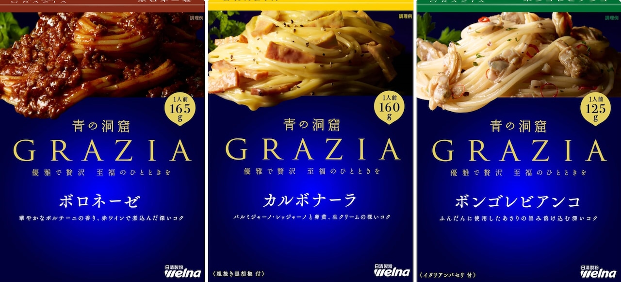 【青の洞窟 GRAZIA ボロネーゼ】ふんだんに使用した挽肉を赤ワインと共に煮込んだ、最後のひとくちまで濃厚なコク深い味わいです。華やかなポルチーニの香りと共に仕上げました。優雅で贅沢、至福のひとときをお楽しみください。【青の洞窟 GRAZIA カルボナーラ】ふんだんに使用したベーコンの旨味とパルミジャーノ・レッジャーノ、卵黄、生クリームで仕上げ、最後のひとくちまで濃厚なコク深い味わいです。優雅で贅沢、至福のひとときをお楽しみください。【青の洞窟 GRAZIA ボンゴレビアンコ】ふんだんに使用したあさりの旨味が溶け込む、最後のひとくちまで濃厚なコク深い味わいです。エクストラバージンオリーブオイルとガーリックの鮮烈な香り立ちと共に仕上げました。優雅で贅沢、至福のひとときをお楽しみください。