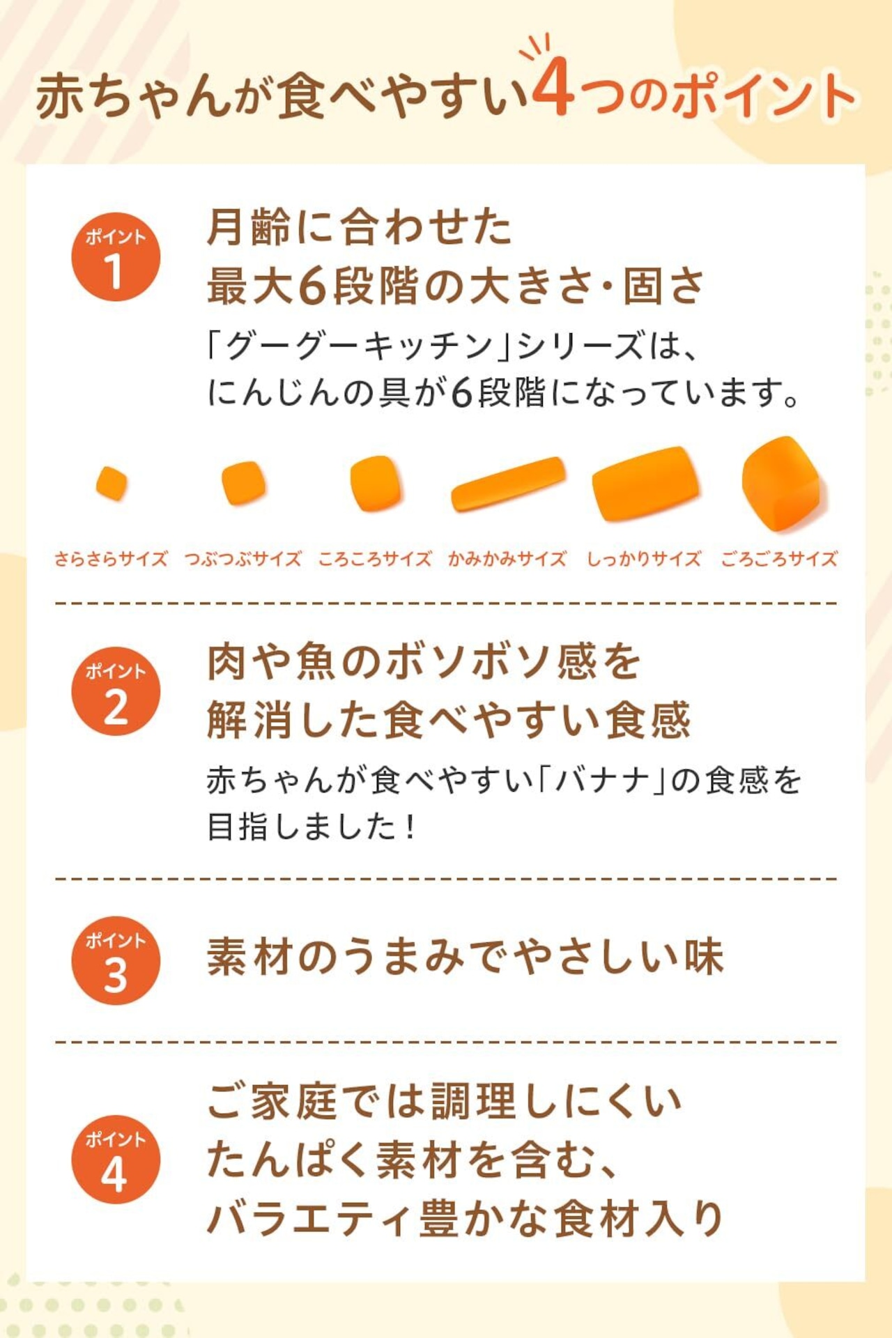 ご家庭では調理しにくいたんぱく素材を含むバラエティ豊かな「具」がたっぷり!●ご使用方法○調理済みですので、そのまま召し上がれます。温めますといっそうおいしく召し上がれます。【お湯で温める場合】袋の封を切らずにお湯の中に1~2分つけて温めてください。袋の穴に、はしなどを差し込んで取り出します。切り口から封をあけ、器などに移してお召し上がりください。※沸騰させて加熱を止めたお湯に入れて温めてください。※熱湯の取り扱いにご注意ください。※加熱後は中身が熱くなっていますので、やけどなどしないように開封には十分ご注意ください。【電子レンジで温める場合】中身を電子レンジ対応の容器に移し、ラップをかけて温めてください。オート(自動)ボタンでの加熱はしないでください。※ラップをとる際に、熱くなった中身がはねることがありますのでご注意ください。【加熱時間の目安】500W:30秒 600W:20秒●使用上の注意○食べ残しや作りおきはあげないでください。○月齢は目安です。お子さまの成長に合わせてご使用ください。のどに詰まらせないよう、必ずそばで見守ってください。○離乳のすすめ方については、専門家にご相談ください。●保存方法 直射日光を避け、常温で保存してください。