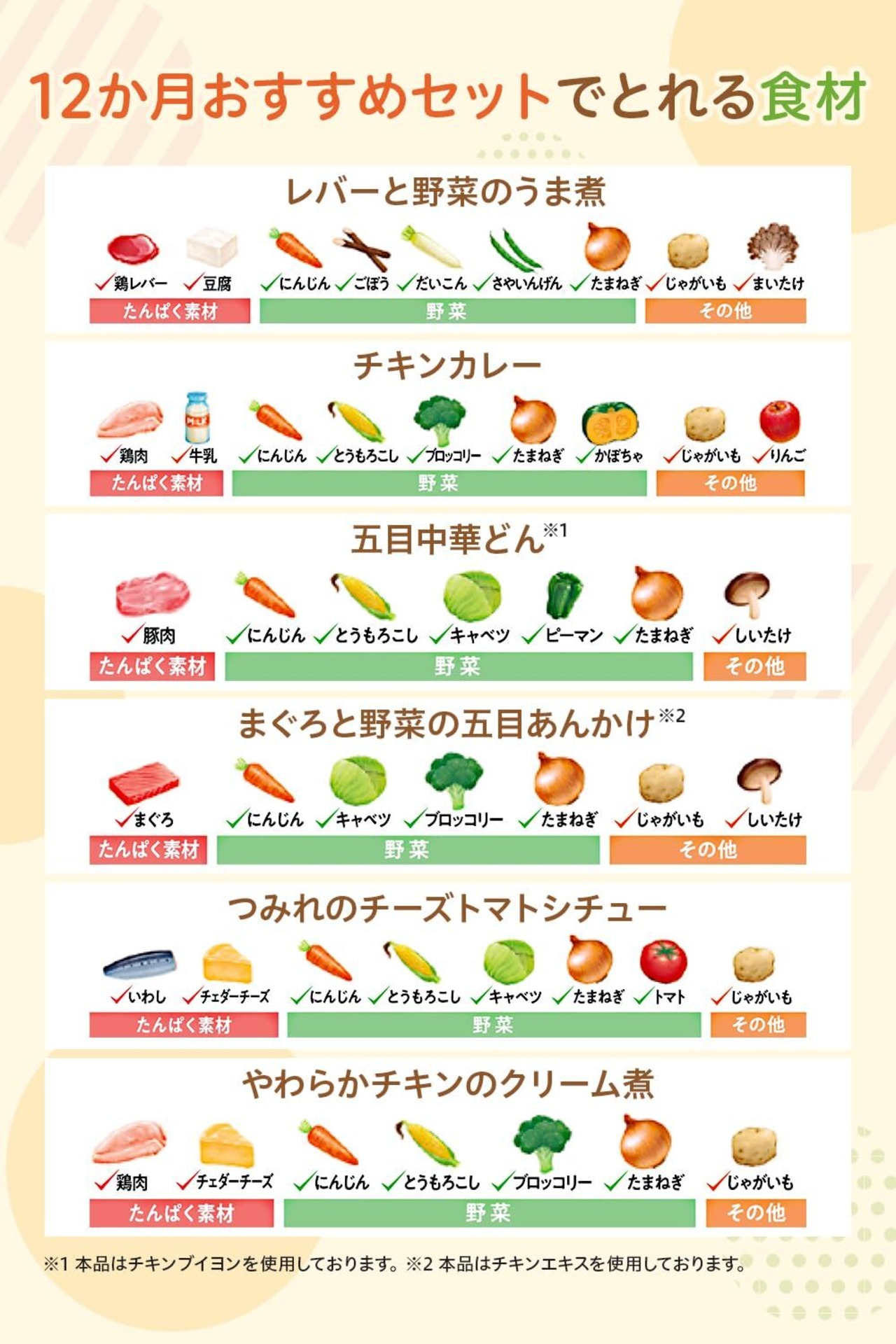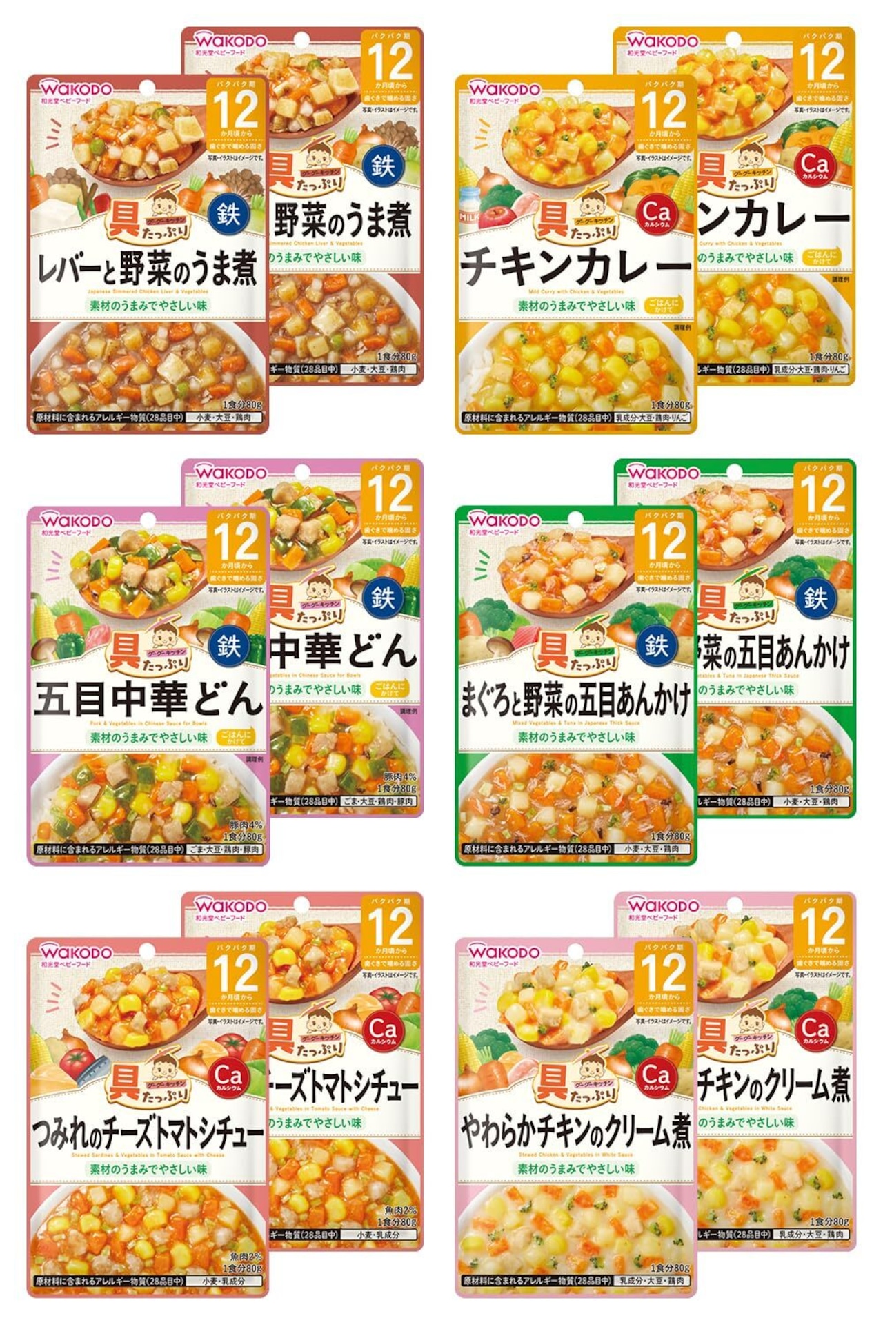 【レバーと野菜のうま煮】野菜(にんじん、ごぼう、だいこん、さやいんげん)、じゃがいも(国産)、オニオンソテー、豆腐(大豆を含む)、かつお昆布だし、チキンブイヨン、しょうゆ(小麦を含む)、鶏レバーペースト、砂糖、みそ、まいたけ水煮、食塩/増粘剤(加工でん粉)、豆腐用凝固剤、ピロリン酸鉄 【チキンカレー】野菜(にんじん、とうもろこし、ブロッコリー)、じゃがいも(国産)、オニオンソテー、牛乳、鶏肉加工品(鶏肉、オニオンソテー、でん粉、粒状大豆たん白、粉末状大豆たん白)、チキンエキス、バター、砂糖、カレー粉、かぼちゃペースト、りんごピューレー、食塩、植物油脂/増粘剤(加工でん粉)、炭酸カルシウム、クエン酸 【五目中華どん】野菜(にんじん(国産)、とうもろこし、キャベツ、ピーマン)、オニオンソテー、豚肉加工品(豚肉、でん粉、食塩、海藻粉末)、チキンブイヨン、しょうゆ(大豆を含む)、しいたけ水煮、ほたてエキス、ごま油、食塩、米酢/増粘剤(加工でん粉)、ピロリン酸鉄 【まぐろと野菜の五目あんかけ】野菜(にんじん、キャベツ、ブロッコリー)、じゃがいも(国産)、オニオンソテー、まぐろ水煮、チキンエキス、砂糖、しょうゆ(小麦・大豆を含む)、しいたけ水煮、かつお昆布だし、植物油脂、食塩、米酢/増粘剤(加工でん粉)、ピロリン酸鉄 【つみれのチーズトマトシチュー】野菜(にんじん(国産)、とうもろこし、キャベツ)、じゃがいも、魚加工品(いわし、パン粉、小麦粉、たまねぎ、植物油脂、食塩)、オニオンソテー、トマトケチャップ、トマトペースト、チェダーチーズ、ほたてエキス、野菜ブイヨンペースト、砂糖、食塩/増粘剤(加工でん粉)、炭酸カルシウム、クエン酸 【やわらかチキンのクリーム煮】野菜(にんじん、とうもろこし、ブロッコリー)、じゃがいも(国産)、オニオンソテー、鶏肉加工品(鶏肉、オニオンソテー、でん粉、粒状大豆たん白、粉末状大豆たん白)、チェダーチーズ、クリーム、バター、全粉乳、砂糖、米酢、チキン・フィッシュブイヨン、食塩、チキンブイヨン/増粘剤(加工でん粉)、炭酸カルシウム、クエン酸