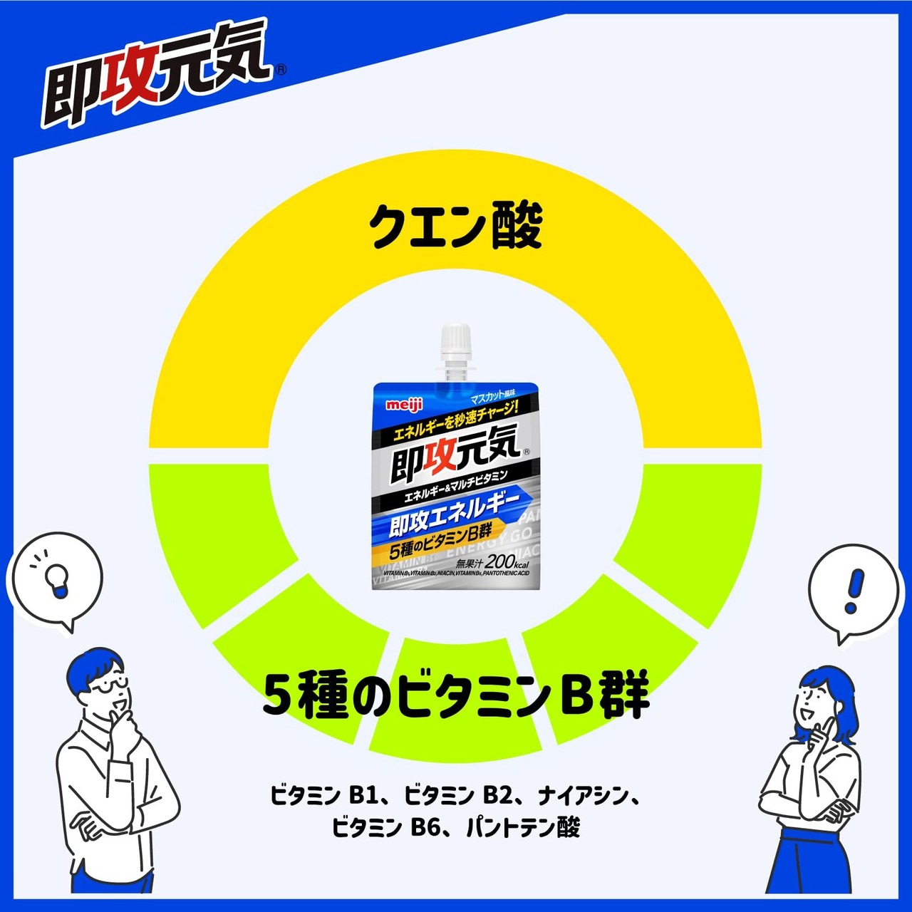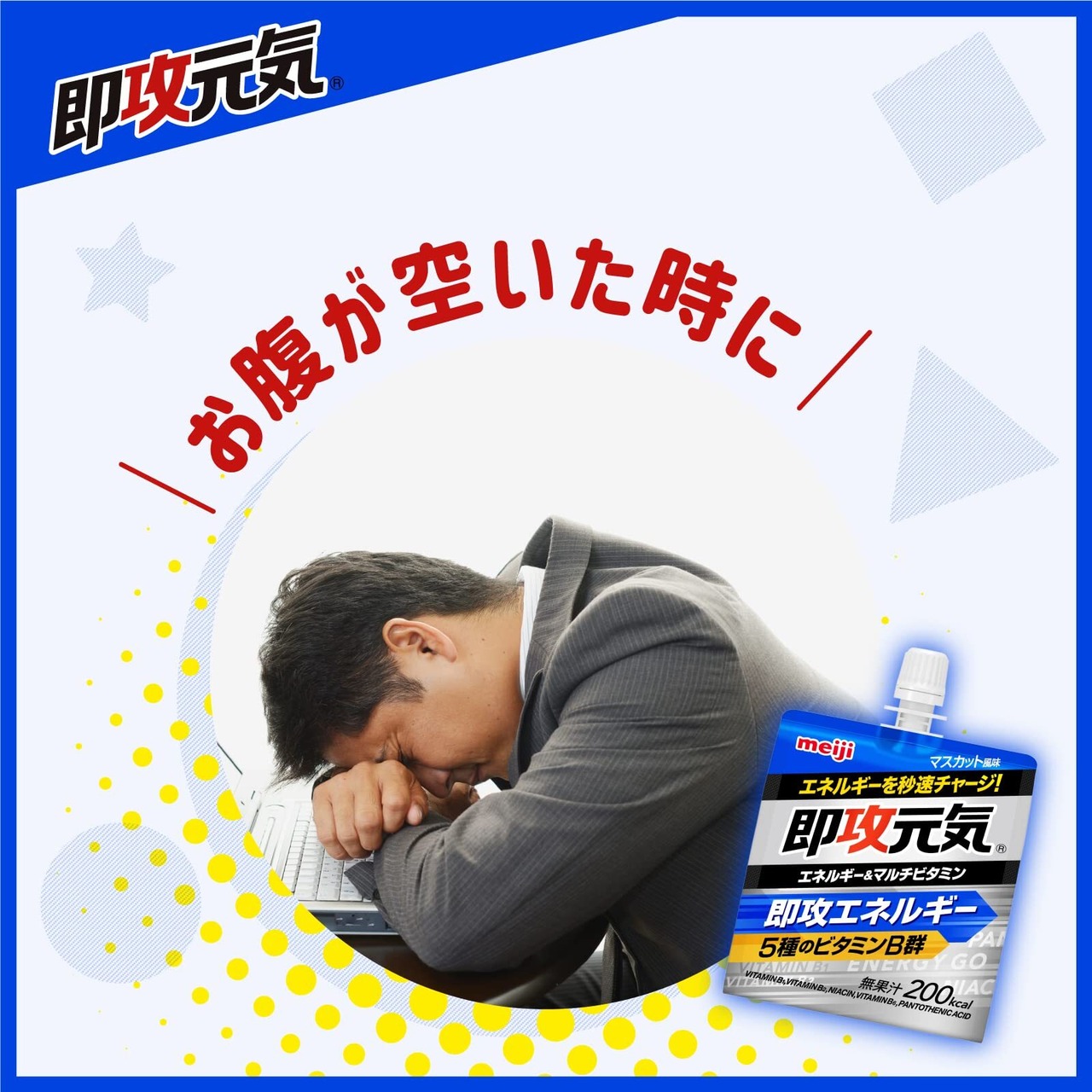 吸収スピードが速いマルトデキストリンに加え、エネルギー代謝に欠かせないビタミンB群を配合したマスカット風味のゼリー飲料。小腹が空いたとき、さっと飲むだけですぐに元気になる。