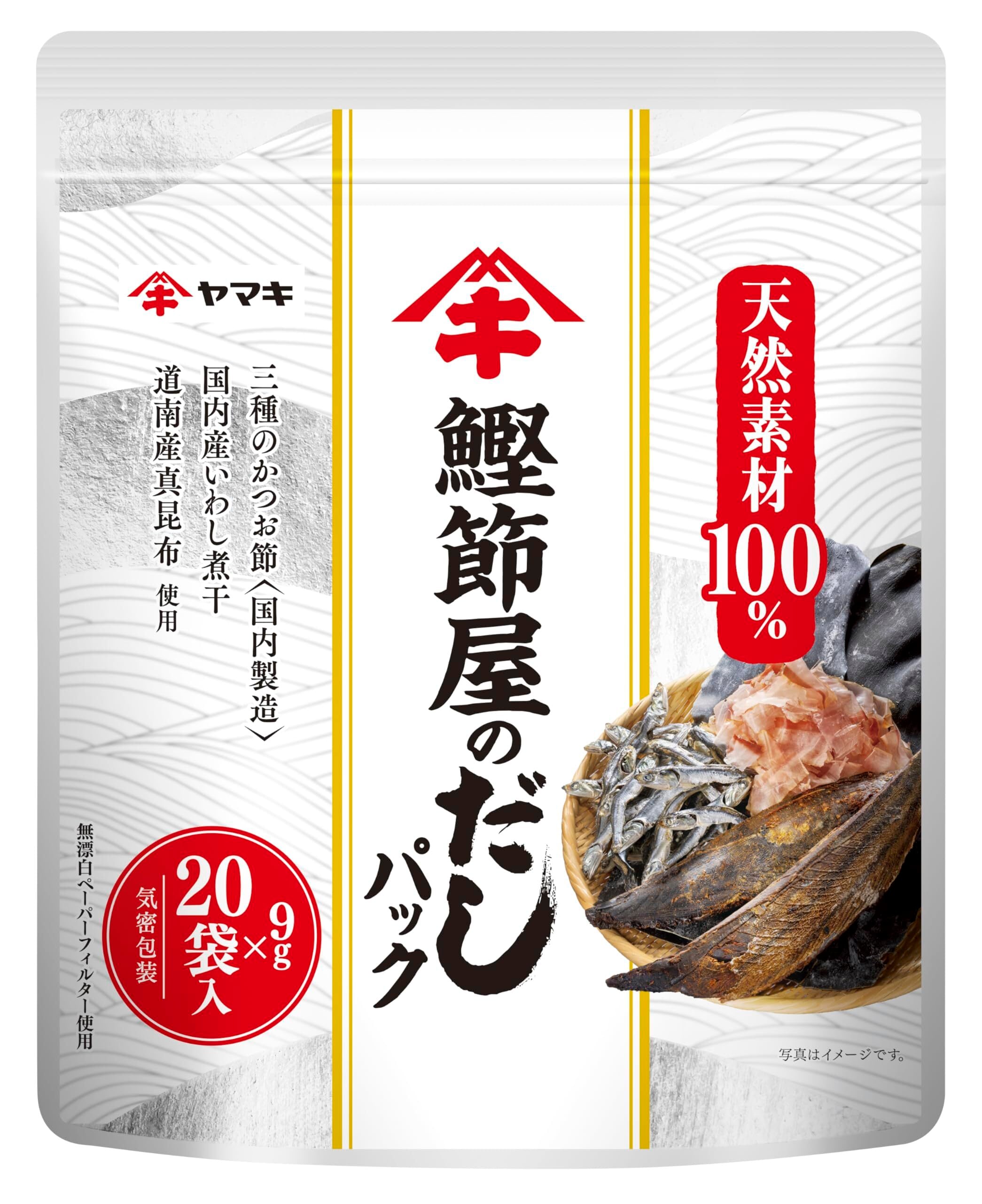 かつお節のうま味と香りにこだわった、天然素材100%のだしパックです。9gが20袋入った大容量タイプです。三種のかつお節(うま味の強い「氷温熟成法かつお節」、燻した香りの強い荒節、まろやかな香りの荒節)を使用しています。また、国内産いわし煮干と道南産真昆布が、さらにだしの香りを引き立てます。