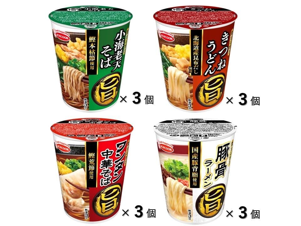 【小海老天そば】油揚げめん(小麦粉(国内製造)、そば粉、植物油脂、植物性たん白、食塩、砂糖、ヤマイモパウダー)、スープ(食塩、糖類、カツオブシパウダー、しょうゆ、ニボシエキス、酵母エキス、植物油脂、唐辛子、全卵粉)、かやく(えび天、揚げ玉、卵、わかめ、ねぎ)/加工でん粉、調味料(アミノ酸等)、炭酸Ca、カラメル色素、リン酸Na、酸化防止剤(ビタミンE)、甘味料(スクラロース)、カロチノイド色素、ビタミンB2、ビタミンB1、(一部にえび・小麦・そば・卵・乳成分・大豆・やまいもを含む)【きつねうどん】油揚げめん(小麦粉(国内製造)、植物油脂、食塩、植物性たん白、チキンエキス)、スープ(食塩、糖類、しょうゆ、コンブエキス、酵母エキス、カツオエキス、カツオブシパウダー、魚介調味料、粉末しょうゆ、植物油脂、シイタケエキス、全卵粉)、かやく(味付油揚げ、揚げ玉、わかめ、卵、ねぎ)/加工でん粉、調味料(アミノ酸等)、炭酸Ca、リン酸Na、酸化防止剤(ビタミンE)、カラメル色素、甘味料(スクラロース)、カロチノイド色素、ビタミンB2、ビタミンB1、(一部に小麦・卵・乳成分・さば・大豆・鶏肉を含む)【ワンタン中華そば】油揚げめん(小麦粉(国内製造)、植物油脂、食塩、しょうゆ)、かやく(ワンタン、卵、ねぎ)、スープ(食塩、粉末しょうゆ、オニオンパウダー、デキストリン、でん粉、大豆たん白、砂糖、カツオエキス、たん白加水分解物、香辛料、ポークエキス、チキン調味料、カツオブシパウダー、植物油脂、酵母エキス、全卵粉)/加工でん粉、調味料(アミノ酸等)、炭酸Ca、カラメル色素、かんすい、カロチノイド色素、酸化防止剤(ビタミンE)、微粒二酸化ケイ素、酸味料、増粘剤(グァーガム)、ビタミンB2、ビタミンB1、香辛料抽出物、香料、(一部に小麦・卵・乳成分・ごま・大豆・鶏肉・豚肉を含む)【豚骨ラーメン】油揚げめん(小麦粉(国内製造)、植物油脂、食塩)、スープ(食塩、乳化油脂、粉末しょうゆ、ポーク調味料、砂糖、野菜パウダー、ポークエキス、香辛料、ポークコラーゲン、豚脂、チキンパウダー、香味油、全卵粉)、かやく(ごま、ねぎ、キクラゲ、紅しょうが)/加工でん粉、調味料(アミノ酸等)、炭酸Ca、微粒二酸化ケイ素、かんすい、酸化防止剤(ビタミンE)、カラメル色素、増粘多糖類、カロチノイド色素、酸味料、香料、ベニコウジ色素、ビタミンB2、ビタミンB1、香辛料抽出物、(一部に小麦・卵・乳成分・ごま・大豆・鶏肉・豚肉・ゼラチンを含む)