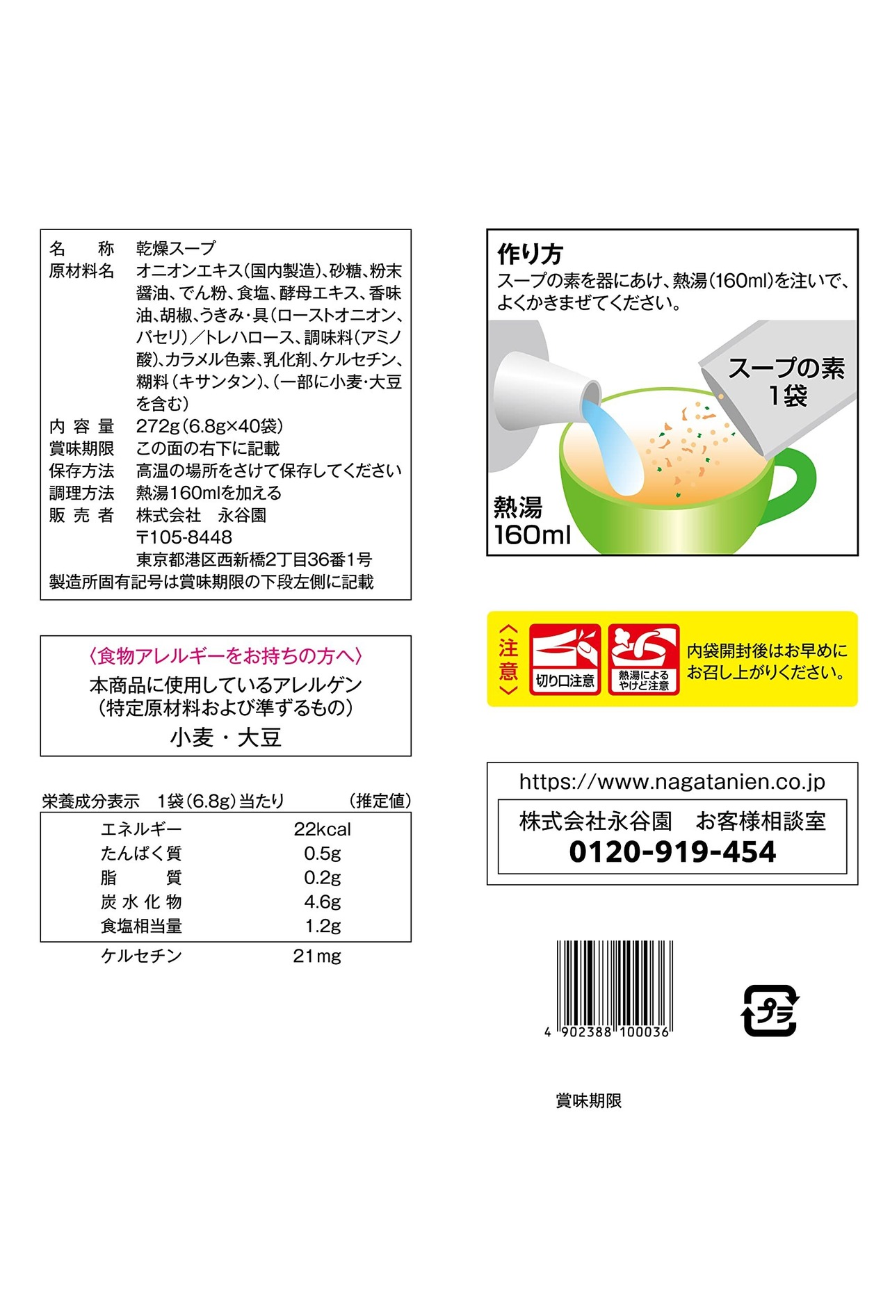 原材料:オニオンエキス(国内製造)、砂糖、粉末醤油、でん粉、食塩、酵母エキス、香味油、胡椒、うきみ・具(ローストオニオン、パセリ)/トレハロース、調味料(アミノ酸)、カラメル色素、乳化剤、ケルセチン、糊料(キサンタン)、(一部に小麦・大豆を含む)