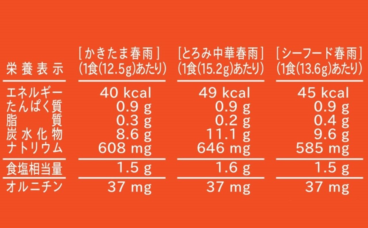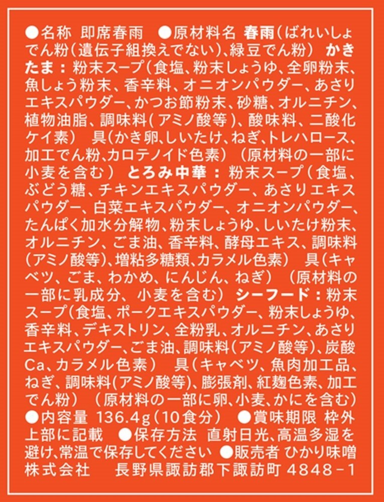 原材料:■春雨:ばれいしょでん粉(遺伝子組み換えでない)、緑豆でん粉■スープ:[かきたま] 粉末スープ(食塩、粉末しょうゆ、全卵粉末、魚醤粉末、香辛料、オニオンパウダー、あさりエキスパウダー、かつお節粉末、砂糖、オルニチン、植物油脂、調味料(アミノ酸等)、酸味料、二酸化ケイ素)、具(かき卵、しいたけ、ねぎ、トレハロース、加工でん粉、カロテノイド色素)[とろみ中華] 粉末スープ(食塩、ぶどう糖、チキンエキスパウダー、あさりエキスパウダー、白菜エキスパウダー、オニオンパウダー、たんぱく加水分解物、粉末しょうゆ、しいたけ粉末、オルニチン、ごま油、香辛料、酵母エキス、調味料(アミノ酸等)、増粘多糖類、カラメル色素)、具(キャベツ、ごま、わかめ、にんじん、ねぎ)[シーフード] 粉末スープ(食塩、ポークエキスパウダー、粉末しょうゆ、香辛料、デキストリン、全粉乳、オルニチン、あさりエキスパウダー、ごま油、調味料(アミノ酸等)、炭酸Ca、カラメル色素)、具(キャベツ、魚肉加工品、ねぎ、調味料(アミノ酸等)、膨張剤、紅麹色素、加工でん粉)