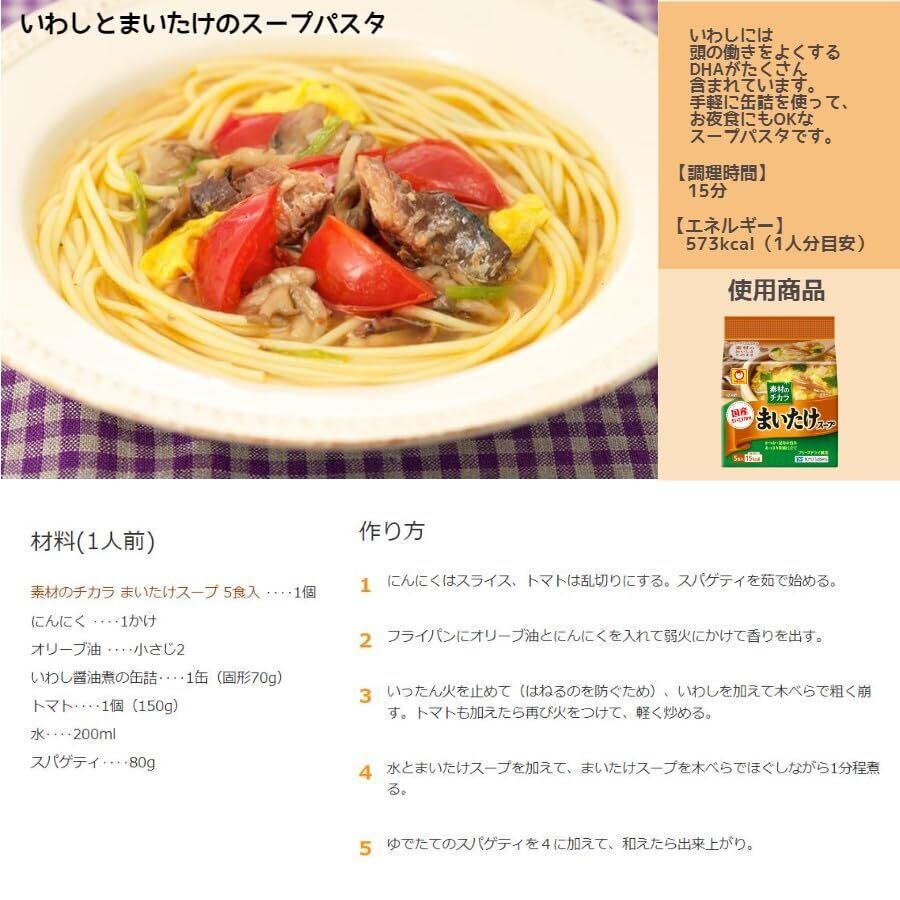 国産まいたけを使用し、まいたけの歯応えある食感とふんわりたまごの和風スープの5食パックです。