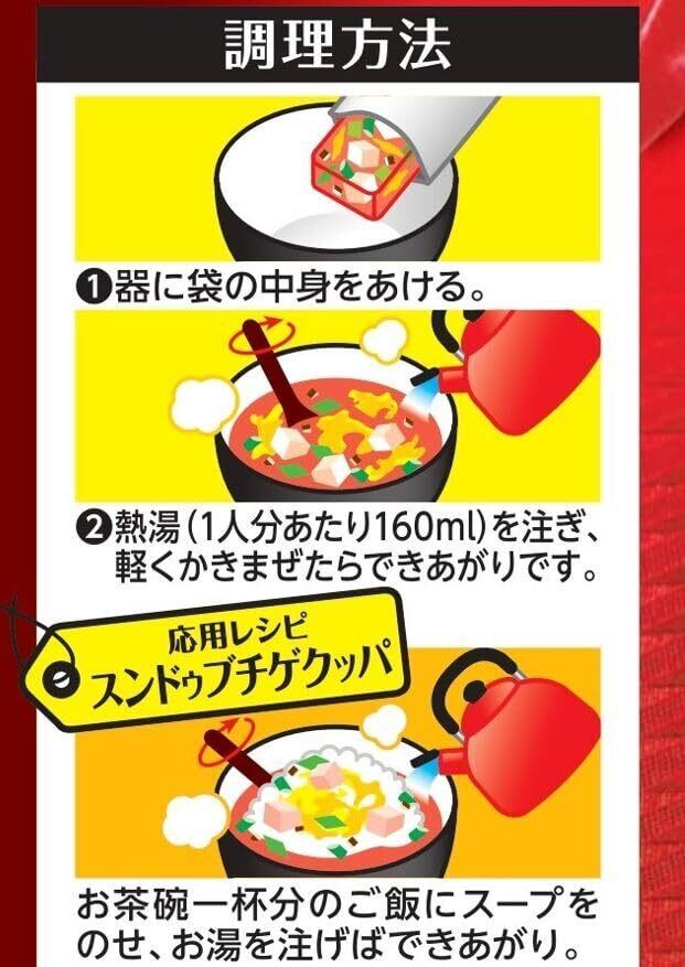 【魚介の旨みと唐辛子の辛み】なめらか食感の豆腐が入った、あさりや昆布の魚介の旨みに、唐辛子の辛みを利かせた、キムチベースの旨辛チゲスープ。具材は、国産丸大豆を使用した豆腐、かきたま、しいたけ、ねぎが入っています。