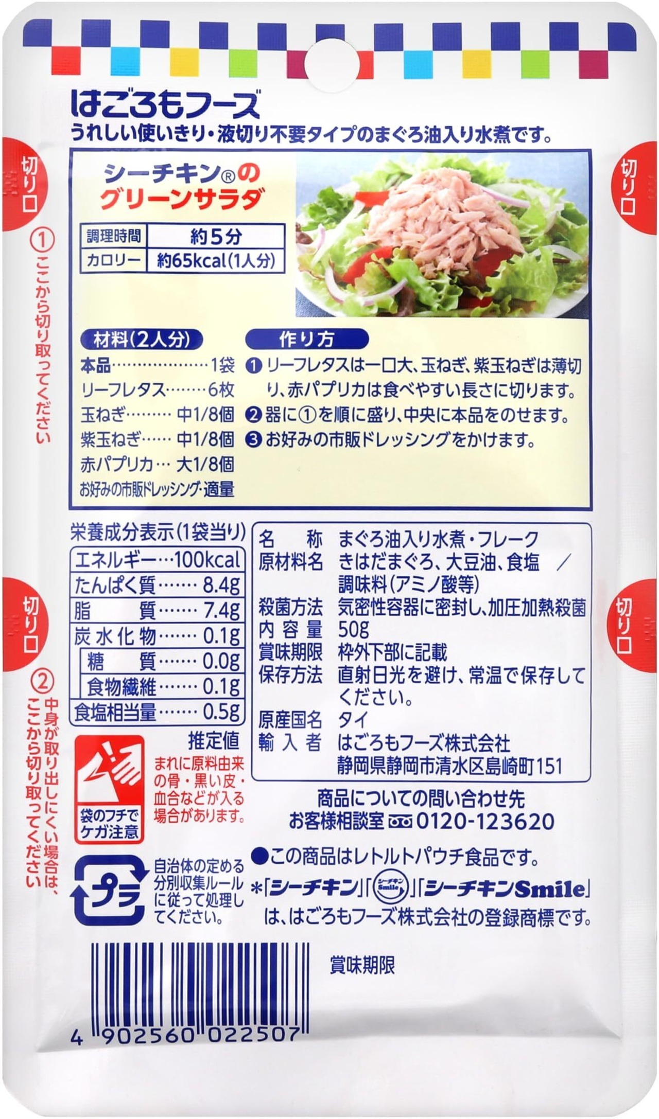きはだまぐろを原料に使用した、油入り水煮タイプのシーチキンです。料理に使いやすく食べやすいように細かくフレーク形状にしました。 内容量50gと単身世帯、おひとり様でのご利用、またトッピングなどに使用するのに便利です。 サラダや炒め物、卵焼きの具材、あえ物、その他にもたくさんの料理にお使いいただけます。パウチタイプなので、使いやすく保存に便利です。