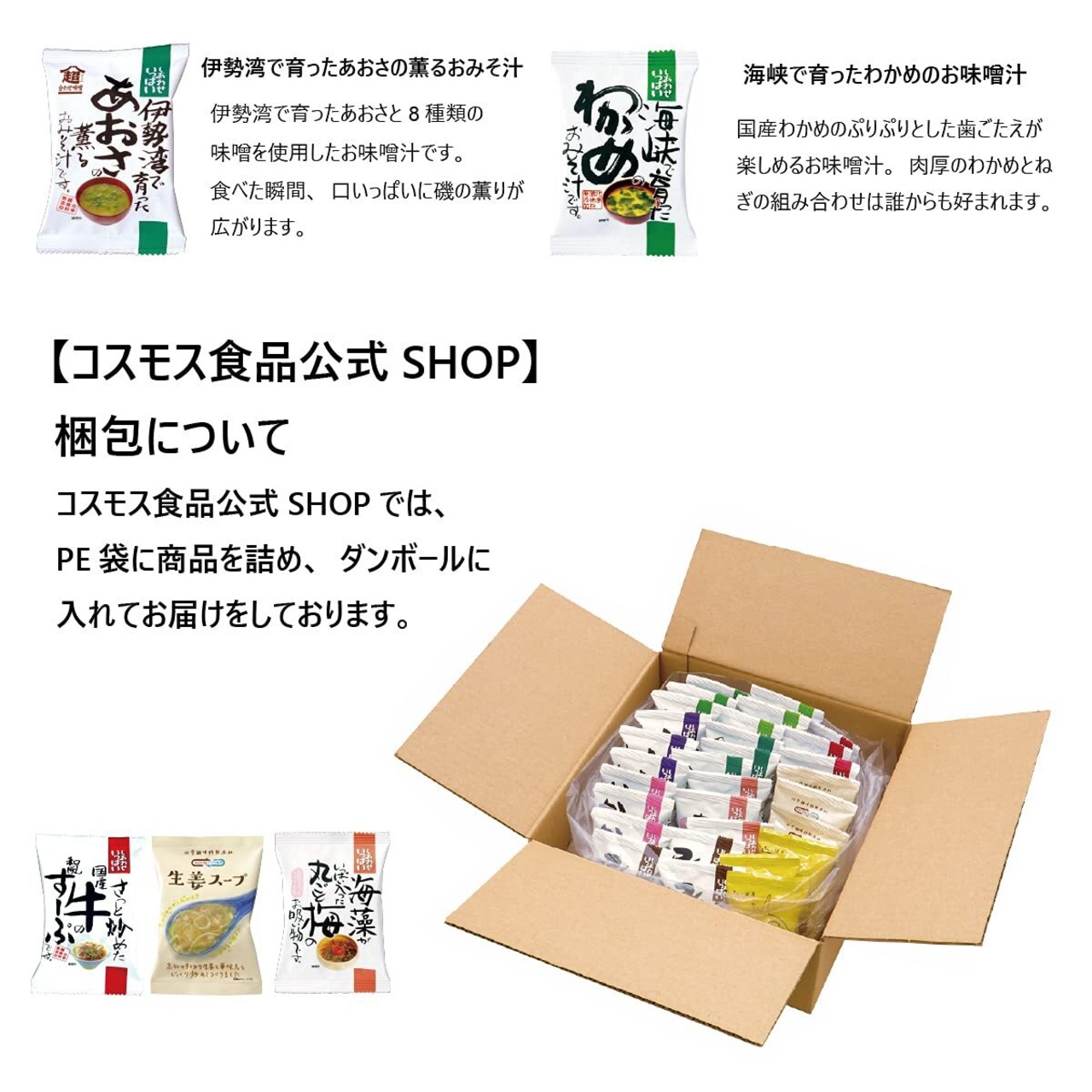 10種類のおみそ汁やスープが入った30食入りのセットです。