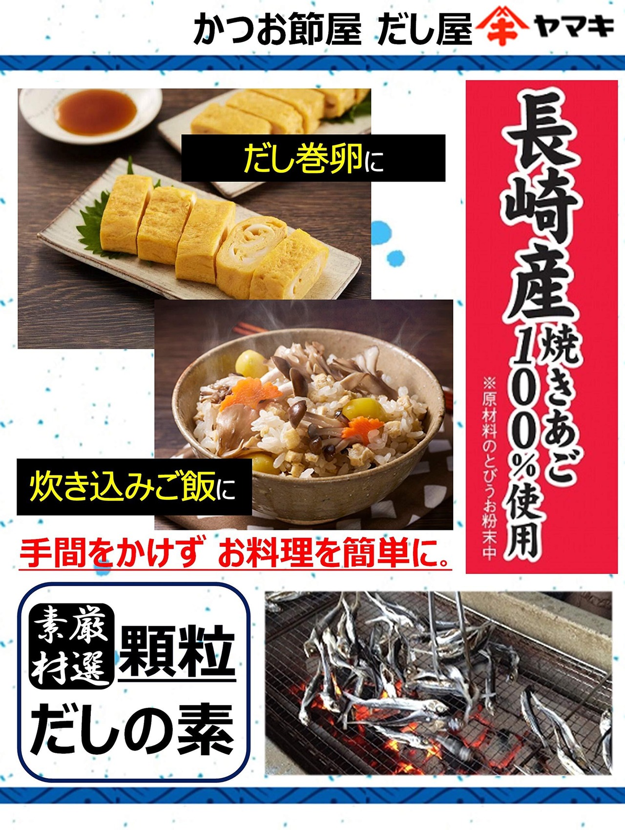 ヤマキ「焼きあごだし」は炭火で丹念に焼き上げた長崎産あご(とびうお)を使用し、焼きあご特有の上品な風味を大切にしただしの素です。ご使用の目安は料理用小さじ山盛り1杯(約4g)あたり、味噌汁、煮物は約4人分(600ml)。鍋物のだしとしては、1000ml~1200ml。めんのかけつゆのおだしとしては、500ml(約2人分)。茶碗蒸しのだしは400ml(約4人分)でお楽しみ下さい。