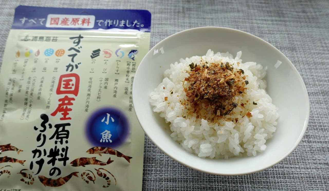原材料:かつお削り節(国産)、砂糖、食塩、しらす、えび、のり、しょうゆ、かつお中骨粉末、酵母エキス、みりん、(一部に小麦・えび・大豆を含む)
