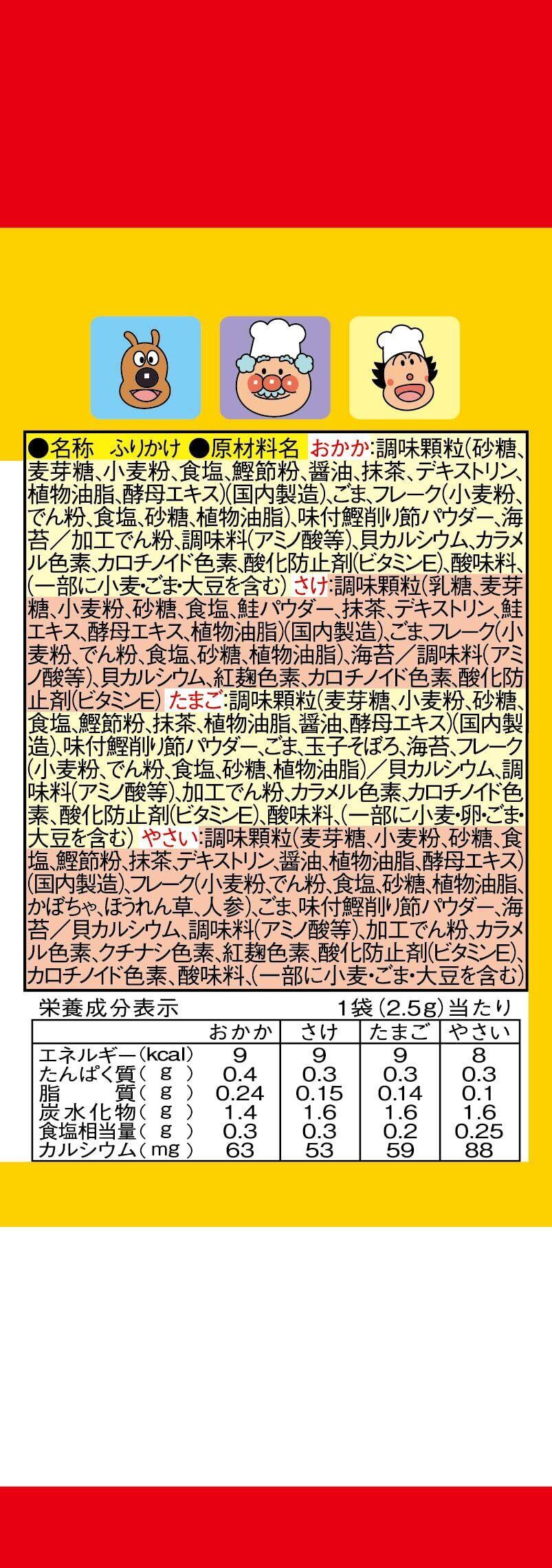 原材料:●おかか:調味顆粒(麦芽糖、小麦粉、砂糖、食塩、鰹節粉、醤油、抹茶、鰹節エキス、デキストリン、酵母エキス)、ごま、フレーク(小麦粉、でん粉、食塩、砂糖、植物油脂)、味付鰹削り節パウダー、海苔、貝カルシウム、調味料(アミノ酸等)、カラメル色素、カロチノイド色素、酸化防止剤(ビタミンE)、酸味料 ●さけ:調味顆粒(乳糖、麦芽糖、小麦粉、砂糖、食塩、鮭パウダー、抹茶、デキストリン、鮭エキス、酵母エキス)、ごま、フレーク(小麦粉、でん粉、食塩、砂糖、植物油脂)、海苔、調味料(アミノ酸等)、貝カルシウム、カロチノイド色素、紅麹色素、酸化防止剤(ビタミンE) ●たまご:調味顆粒(麦芽糖、砂糖、小麦粉、食塩、鰹節粉、抹茶、醤油、植物油脂、鰹節エキス、酵母エキス)、ごま、味付鰹削り節、フレーク(小麦粉、でん粉、食塩、砂糖、植物油脂)、玉子そぼろ、海苔、貝カルシウム、調味料(アミノ酸等)、カロチノイド色素、カラメル色素、酸化防止剤(ビタミンE)、酸味料 ●やさい:調味顆粒(麦芽糖、小麦粉、砂糖、食塩、鰹節粉、抹茶、デキストリン、醤油、鰹節エキス、酵母エキス)、ごま、フレーク(小麦粉、でん粉、食塩、砂糖、植物油脂、かぼちゃ、ほうれんそう、にんじん)、味付鰹削り節パウダー、海苔、貝カルシウム、調味料(アミノ酸等)、カラメル色素、クチナシ色素、カロチノイド色素、酸化防止剤(ビタミンE)、紅麹色素、酸味料
