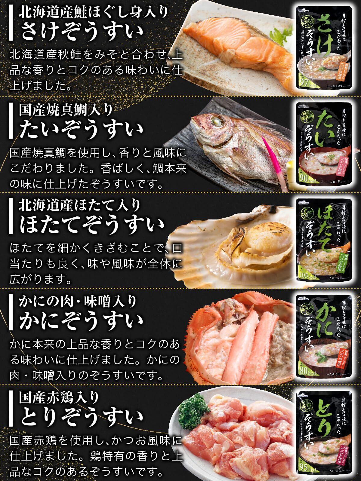 【こだわりの食材を使用】国内産のお米に組み合わせる食材ひとつひとつにこだわりを持って厳選しました。やさしい味つけでありながらも鶏や魚介の旨味を引き出した素材本来の味を楽しめるお粥となっております。ぞうすいシリーズでは特に国産食材にこだわっており、鯛やホタテ、カニなど高級感ある食材を使用し上品に仕上げました。