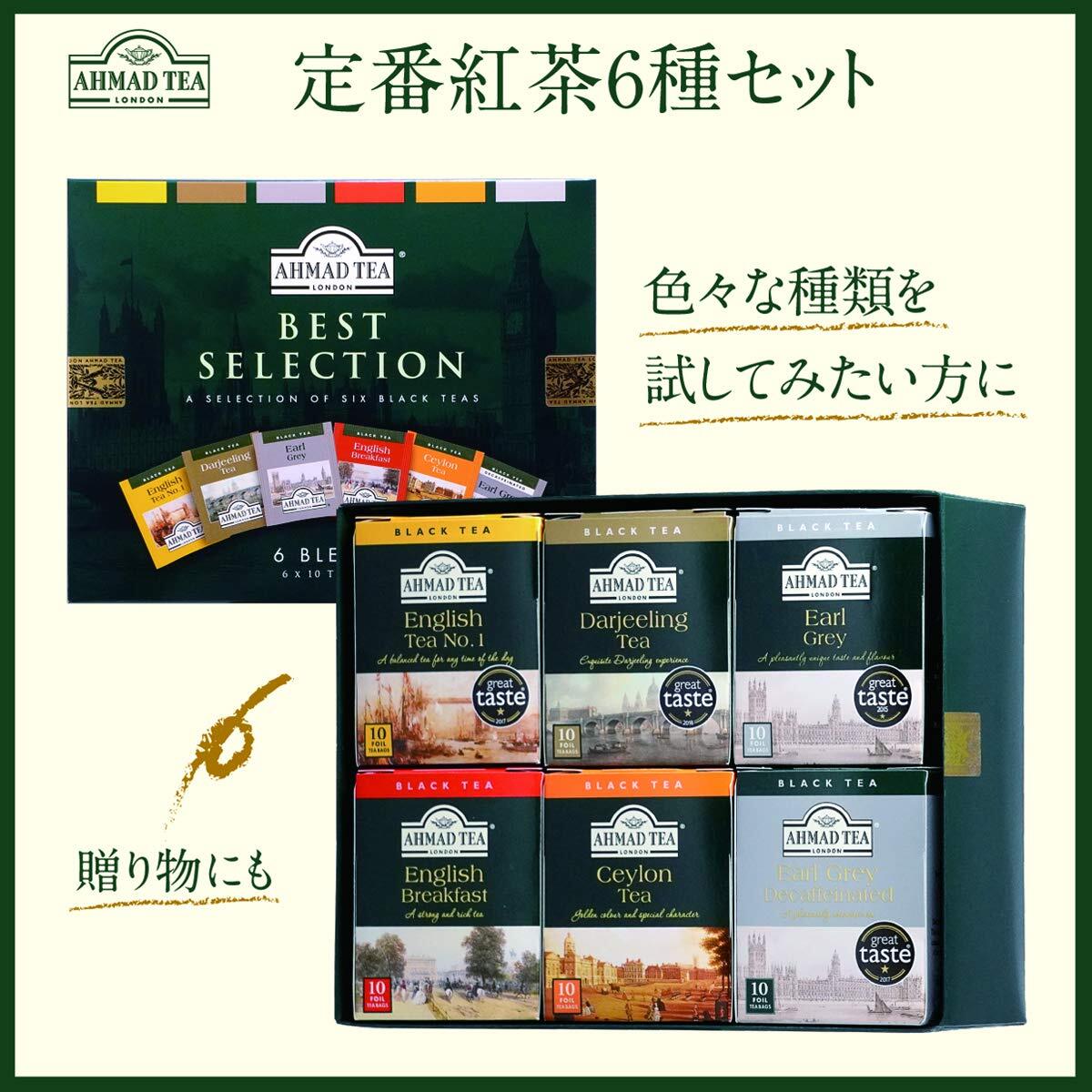 Ahmad Tea (アーマッドティー) ザ・ベスト・セレクション ティーバッグ 60袋 [アールグレイ, デカフェアールグレイ, イングリッシュティーNo.1, イングリッシュブレックファースト, セイロン, ダージリン 各10袋] 120g