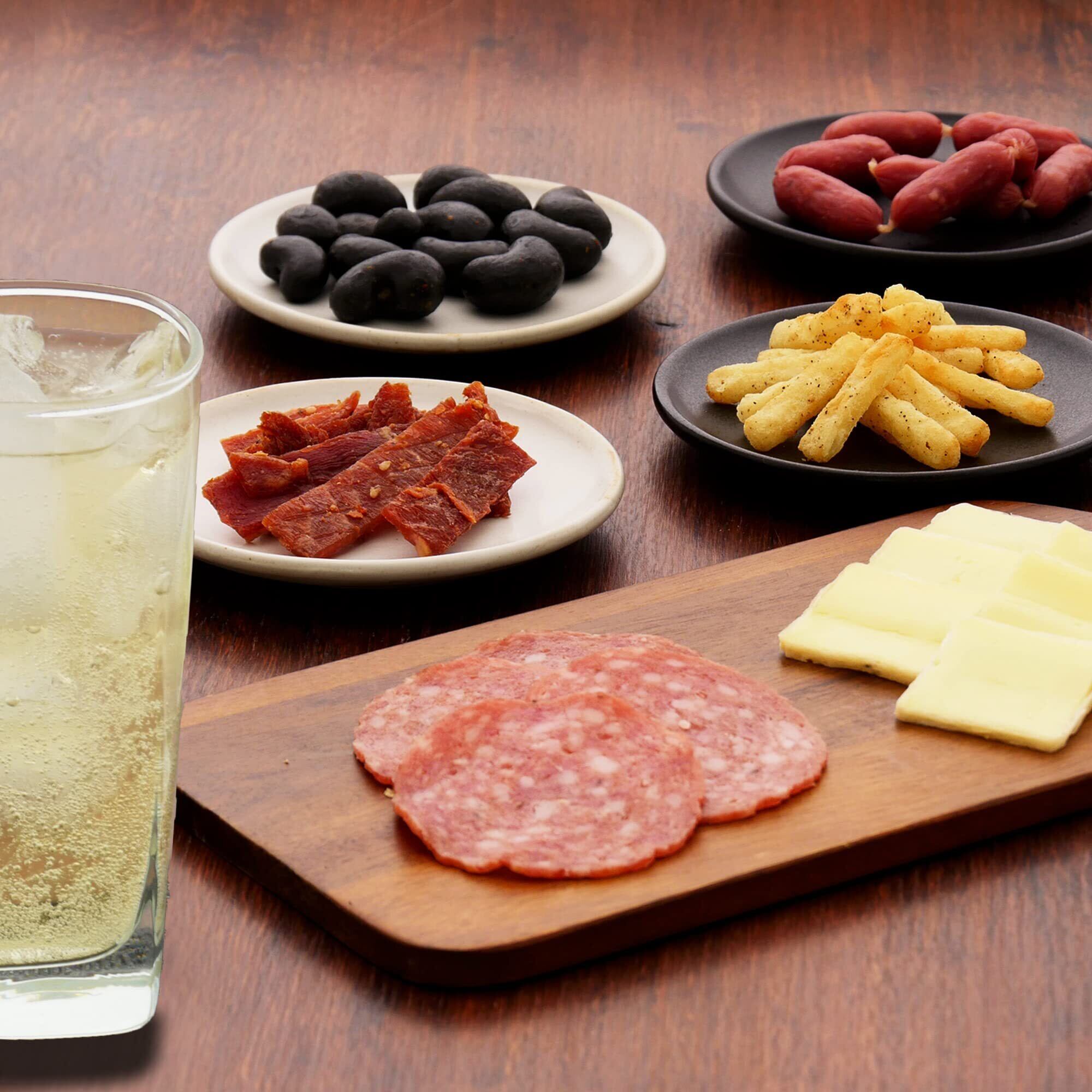 ハイボールがすすむチーズ、サラミ、ナッツ等おつまみ6品の詰め合わせです。