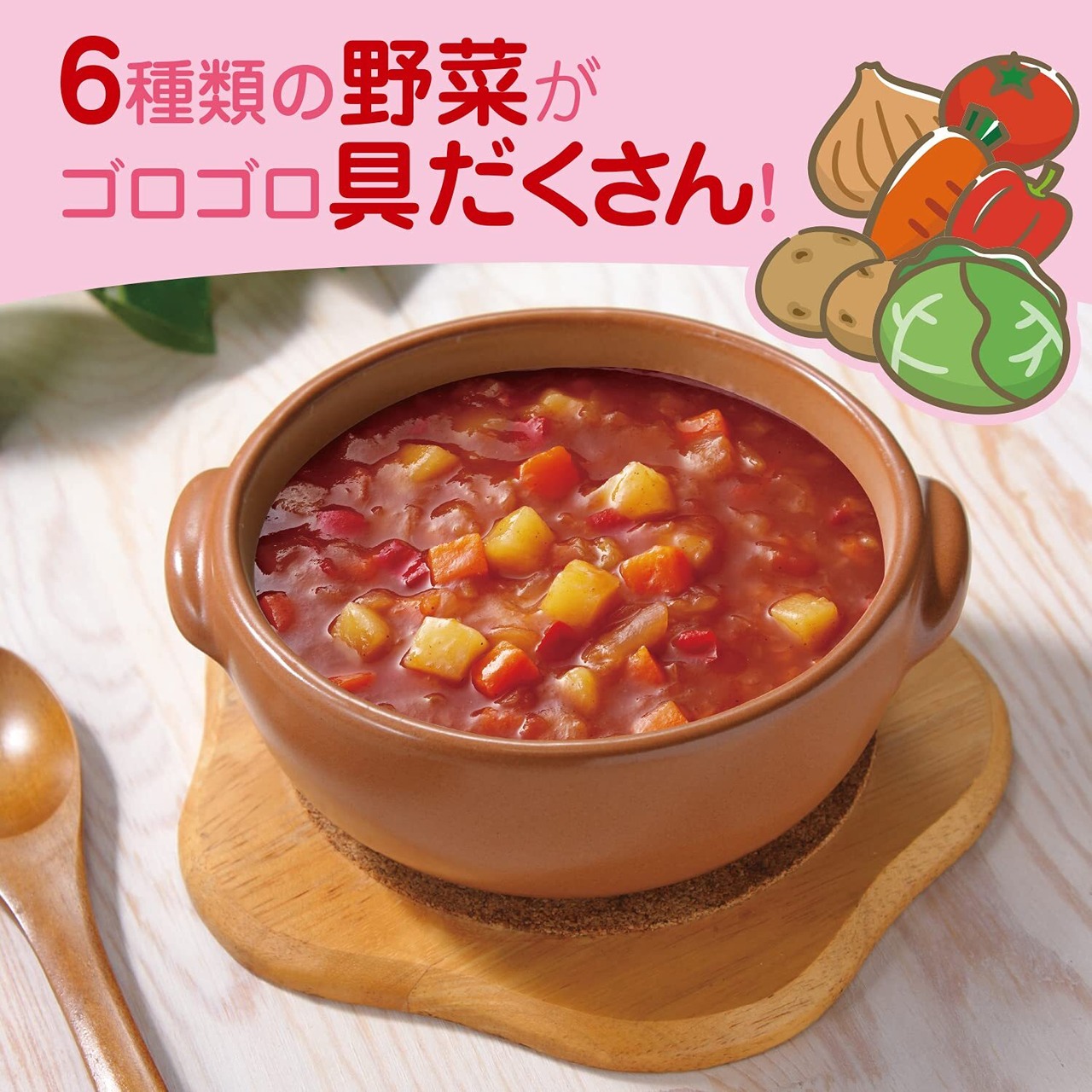 野菜(じゃがいも(中国)、たまねぎ、キャベツ、にんじん、トマト、赤ピーマン)、トマトペースト、砂糖、チキンブイヨン、炒めたまねぎペースト、食塩、たん白加水分解物、食酢、にんにくペースト、ローストガーリックシーズニング、香辛料、酵母エキス、チーズパウダー/増粘剤(加工デンプン)、調味料(アミノ酸等)、香料、(一部に乳成分・大豆・鶏肉を含む)