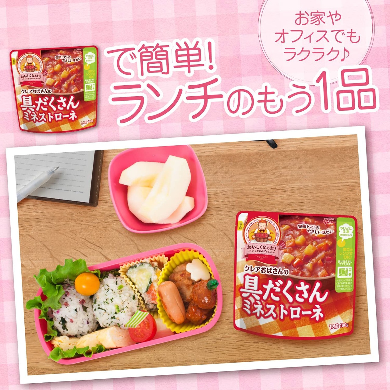 ●「クレアおばさん」こだわりのブイヨンをベースに仕上げた、コクのある味わいの具だくさんスープです。完熟トマトのまろやかな旨みが味わえます。にんじん、じゃがいもなどの野菜がたっぷり入って具だくさん。じっくり煮込まれたようなとろみが、満足感のある食べ応えです。・袋ごと電子レンジで温められるので、お湯を沸かすなどの手間がかからずお楽しみいただけます。・常温保存できるので、忙しい時・手軽に済ませたい時の食事の為の買い置きにもおすすめです。・離れて暮らす家族への仕送りなどにもご活用ください。